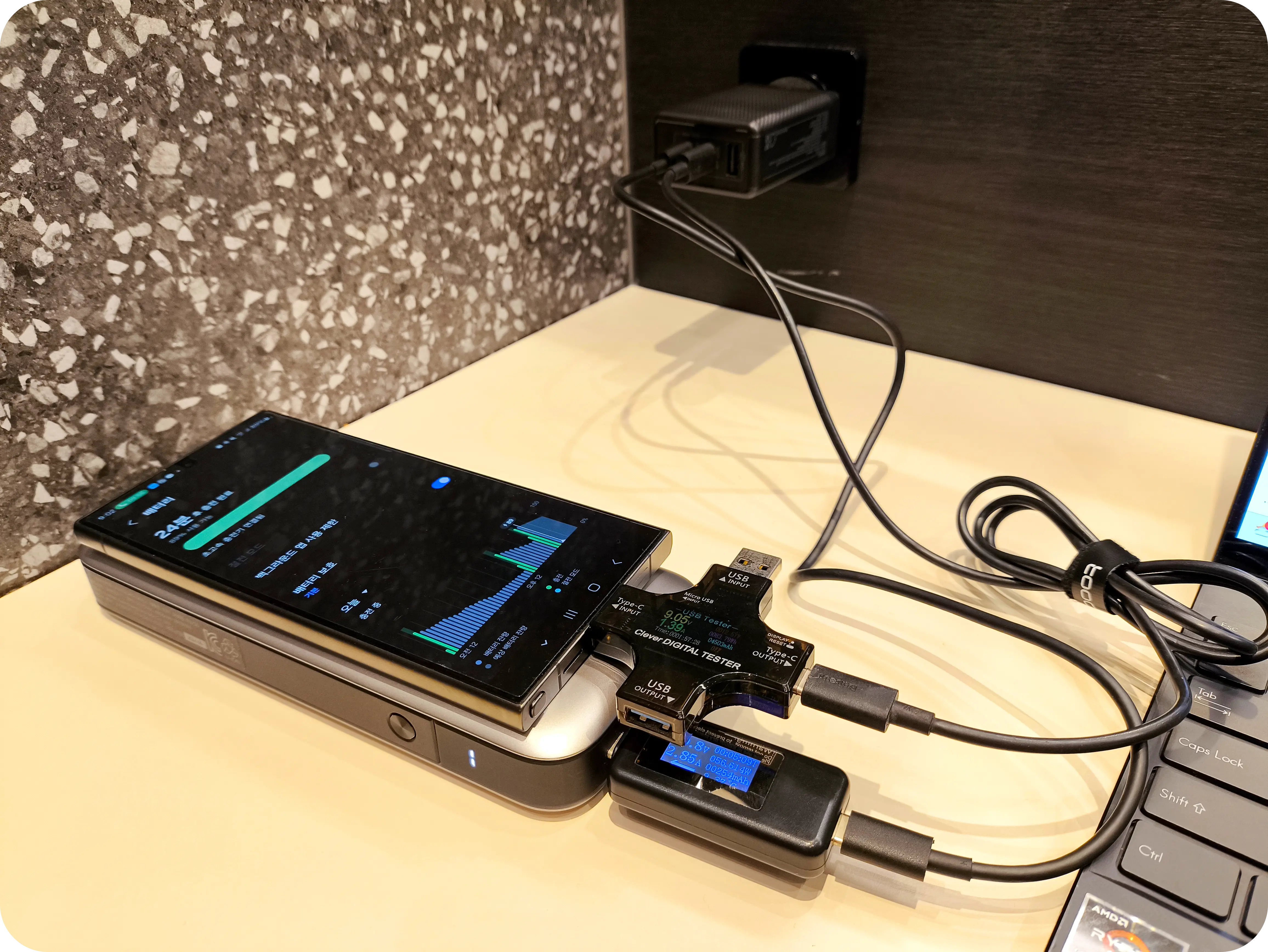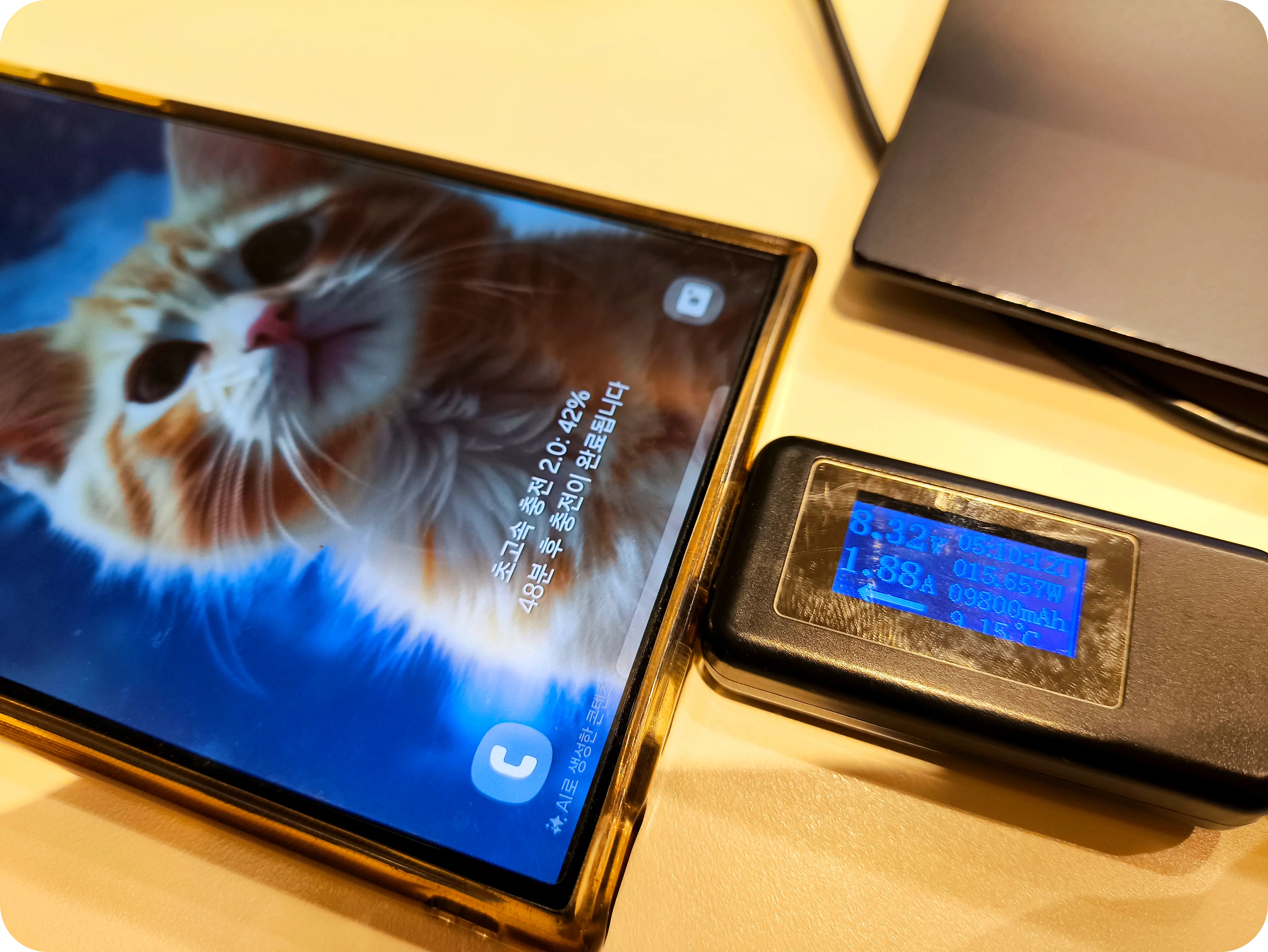 갤럭시 S24 울트라를 1 포트에 연결하니 초고속 2.0 충전이 되는 것을 확인했다. 출력도 확인해 보니 30W 이상으로 충전이 잘 되는 것을 확인했다. 45W를 지원하는 것은 보지 못했으나 초고속 2.0이면 지원을 할 것 같다.