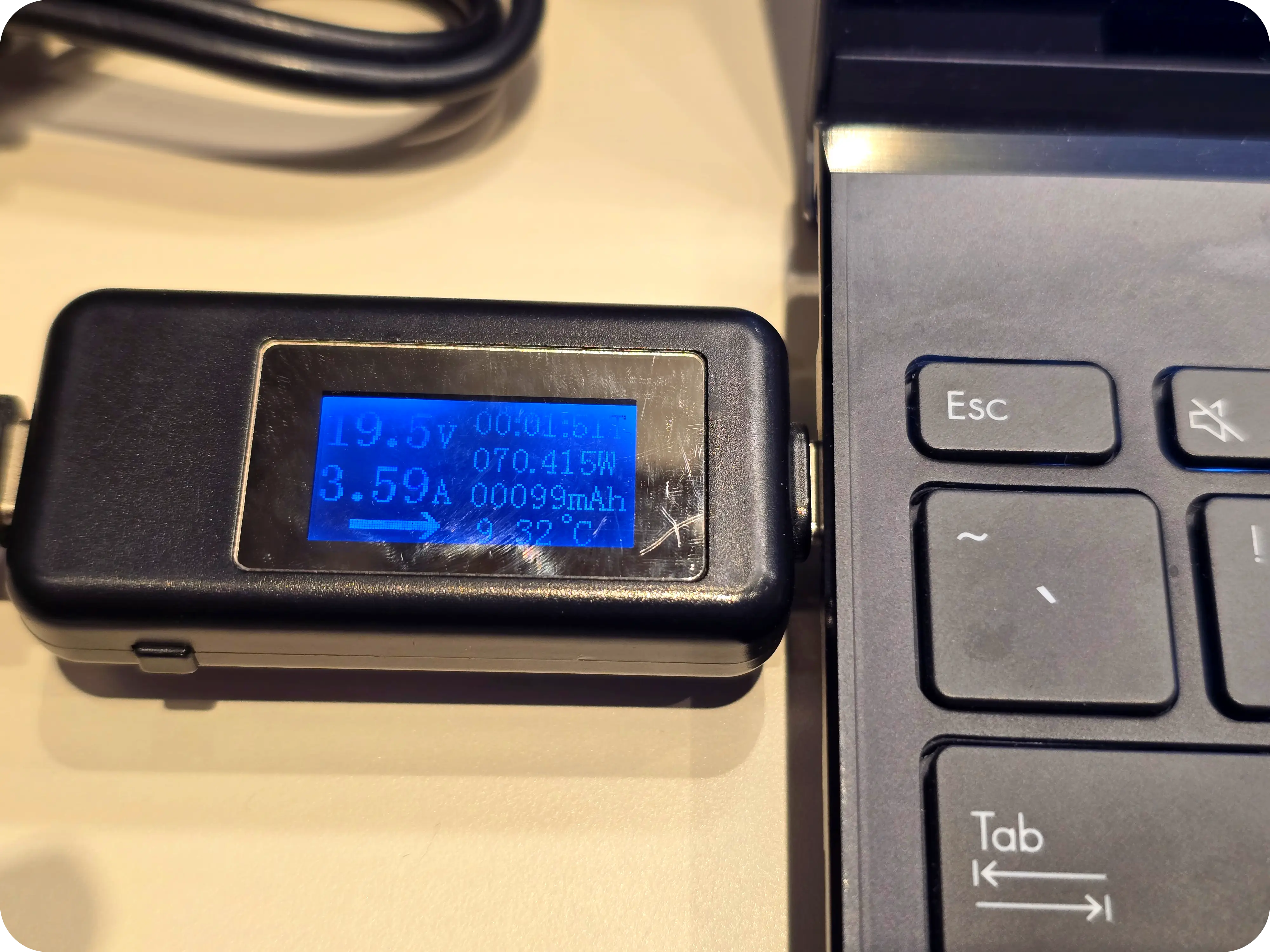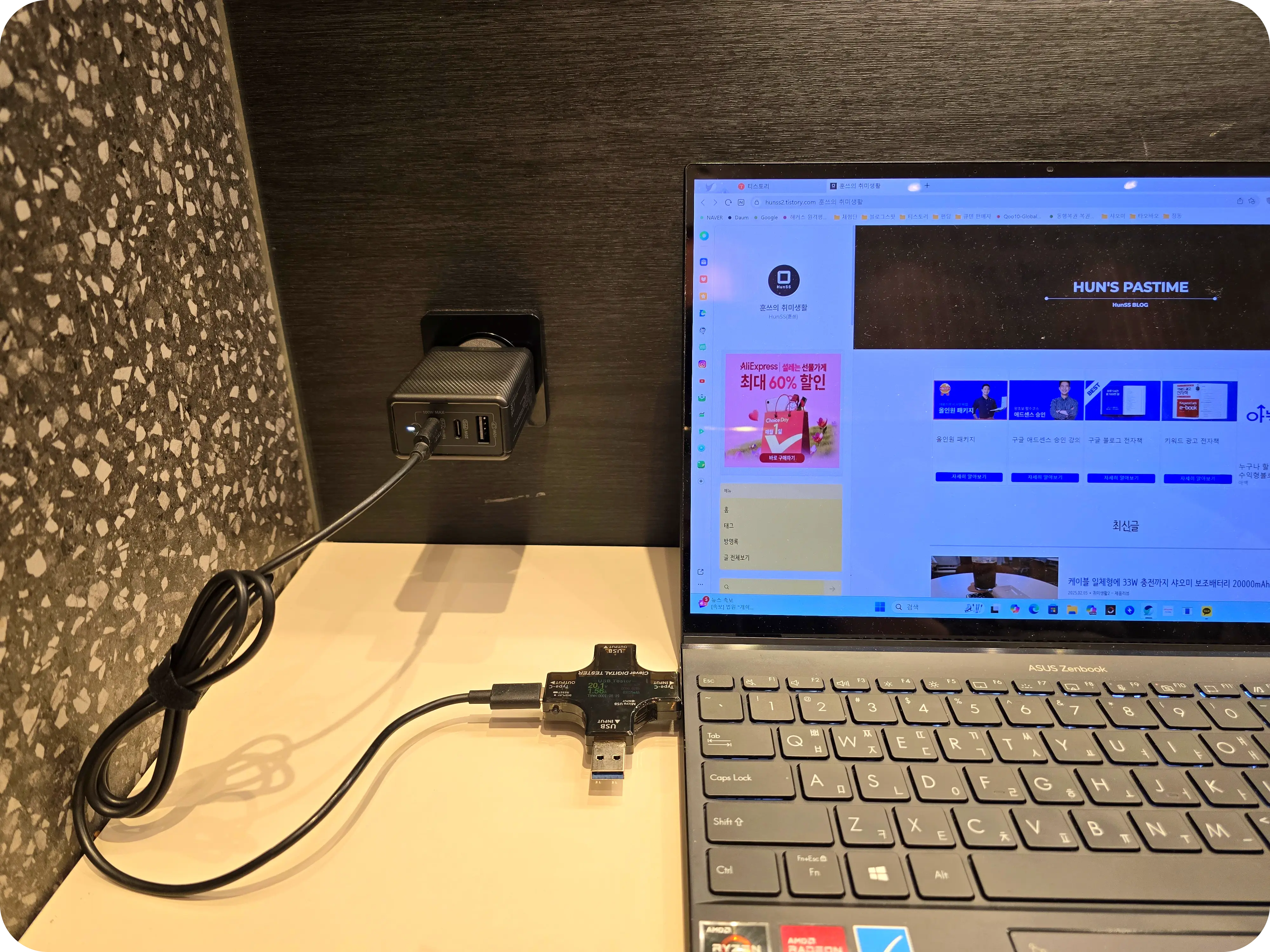 100W를 지원하는 ASUS의 젠북 노트북. PD충전을 지원하지만 100W 미만의 충전기를 연결하면 저속충전기라고 주의 문구가 나오는 제품이다. 아트뮤 초고속 충전기인 GS610은 100W의 출력을 내주는 만큼 노트북에서 저속충전기라는 문구가 나오지 않는다.