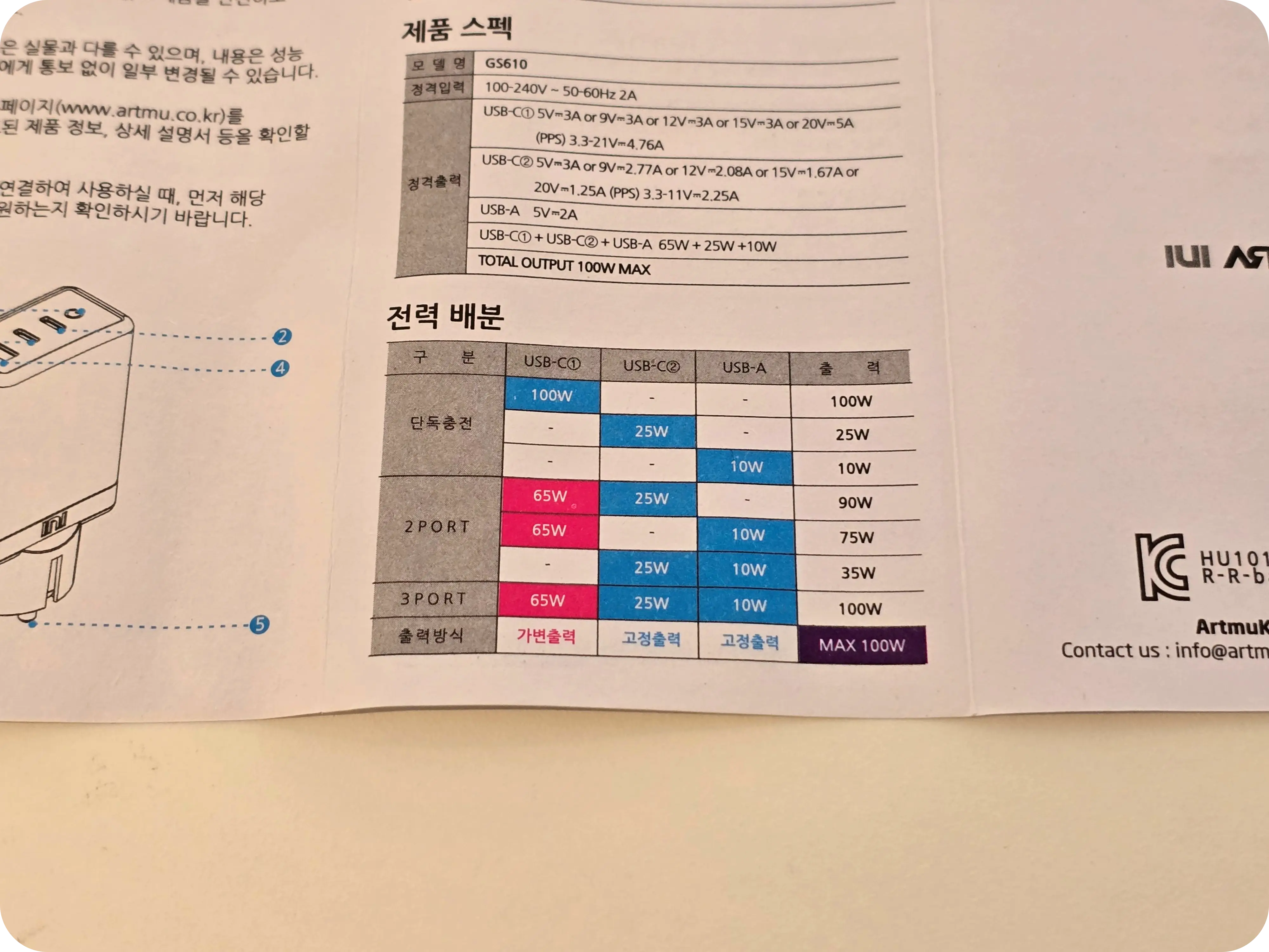 위에서 부터 100W, 25W, 10W를 지원하는 포트구성이다. 아트뮤 GS610은 신기하게도 마지막 포트인 USB-A 포트는 10W까지 밖에 지원을 하지 않는다. 워치나 이어폰 등 저전력으로 충전을 해야 하는 제품에 이용을 하라고 나온 포트이다.