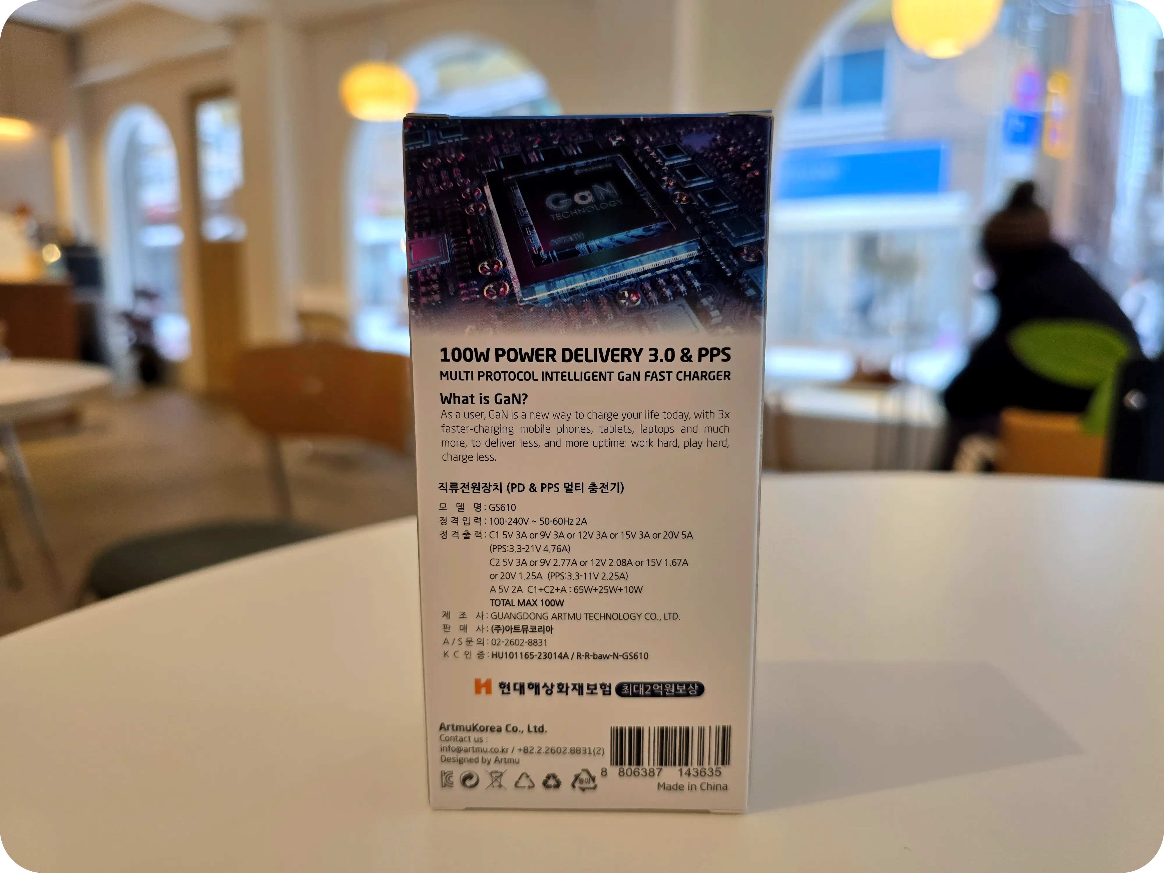 아트뮤 GS610 초고속 충전기는 아담한 상자에 비닐까지 밀봉되어있게 깔끔한 포장으로 배송이 되었다. 우선 패키징이 단단하고 상자 파손 없이 배송이 되어 너무 만족스러운 출발
