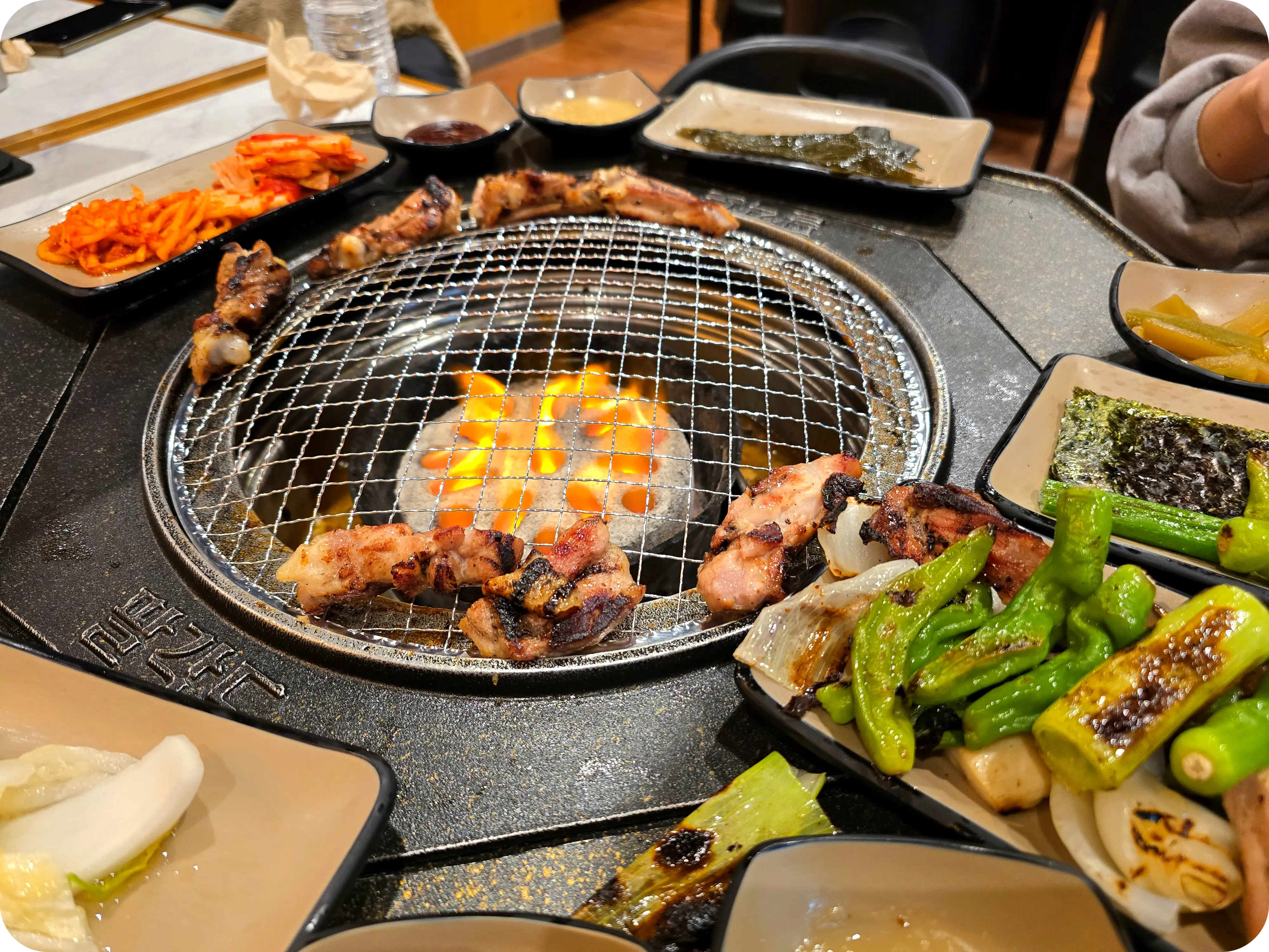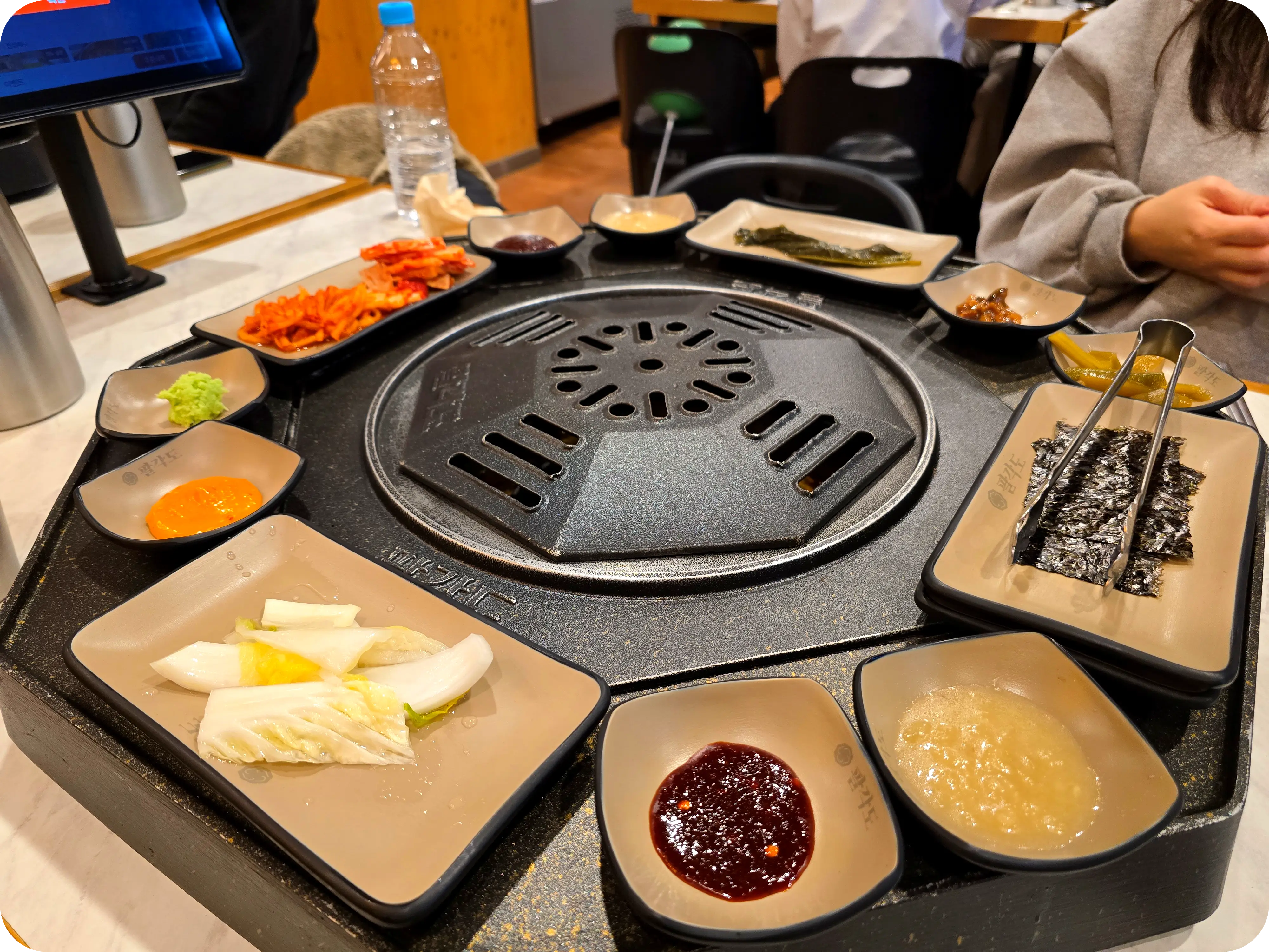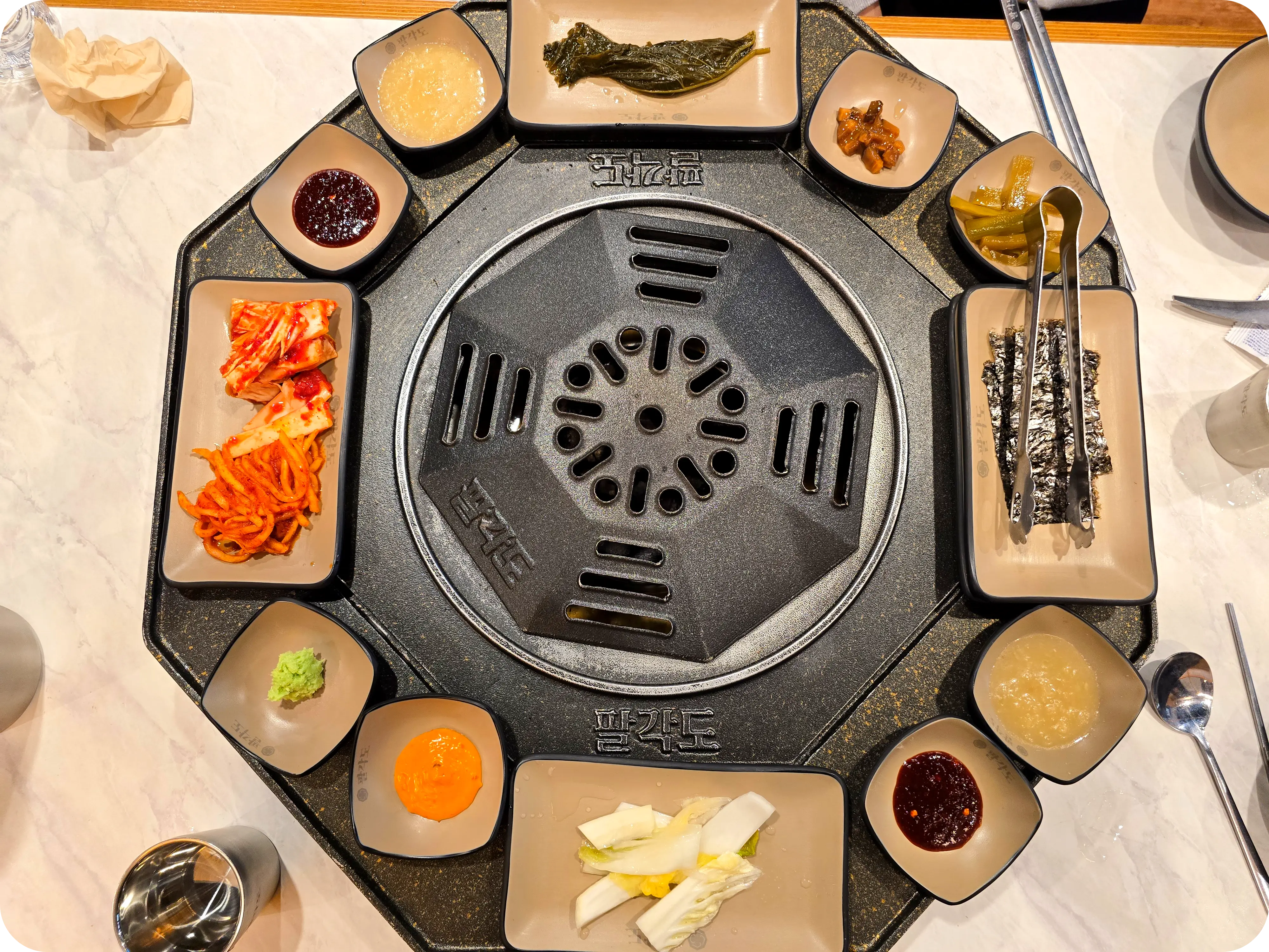주문과 동시에 차려지는 한상. 팔각도라는 이름답게 팔각형의 불판이 있는데 진짜 신기하게 생겼다. 이런 불판은 처음보며 한쪽면으로 반찬과 소스를 올려주는데 딱 맞아떨어지는 게 너무 마음에 든다.