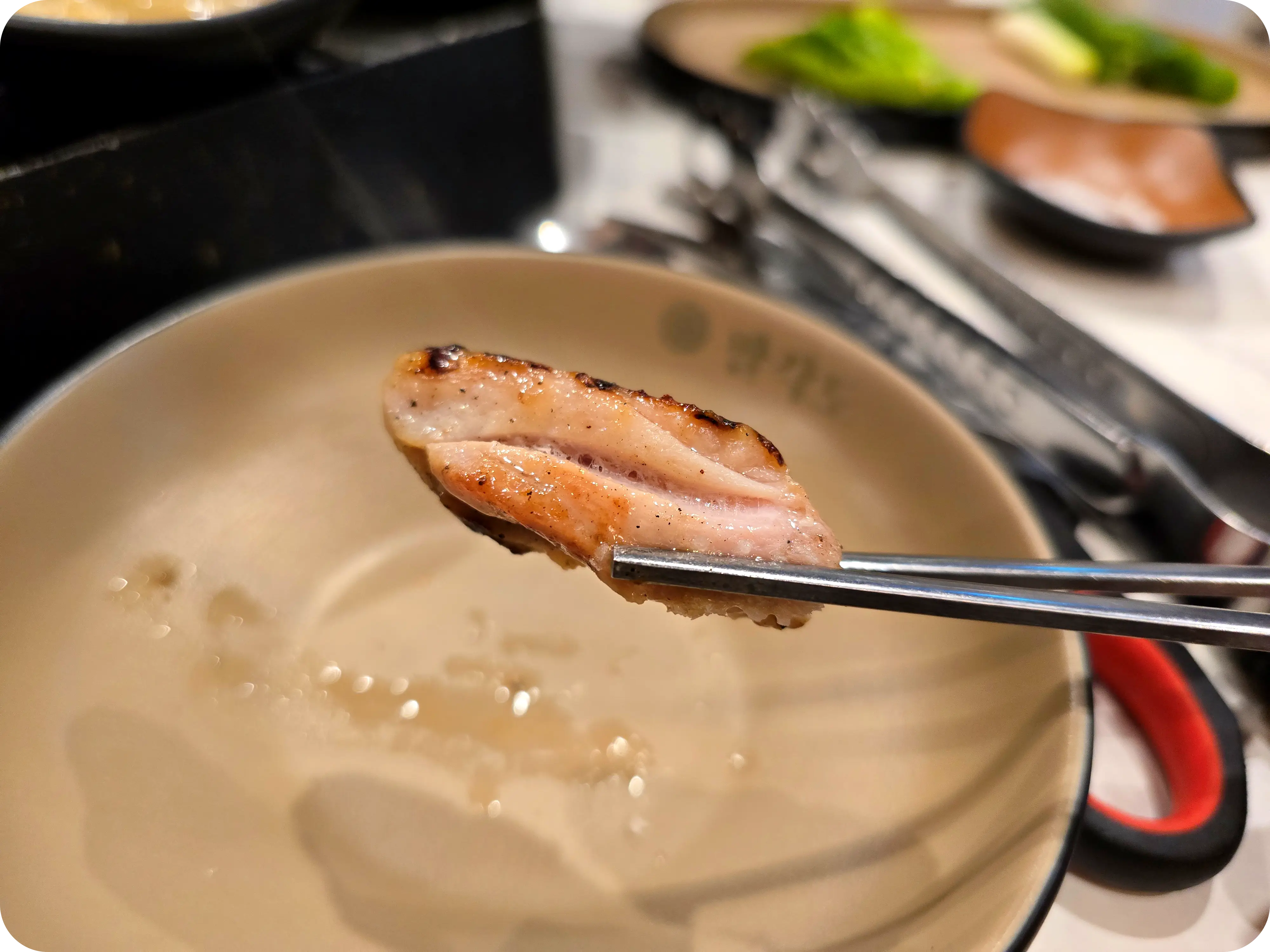 소금은 셀프바에 있는데 소금만 찍어먹어도 너무나 맛있다. 적당히 지방이 섞여있는 닭갈비 부위와 겉이 바싹익어 식감이 너무 좋다. 여기에 와사비까지 얹어먹으면 무한흡입 가능!