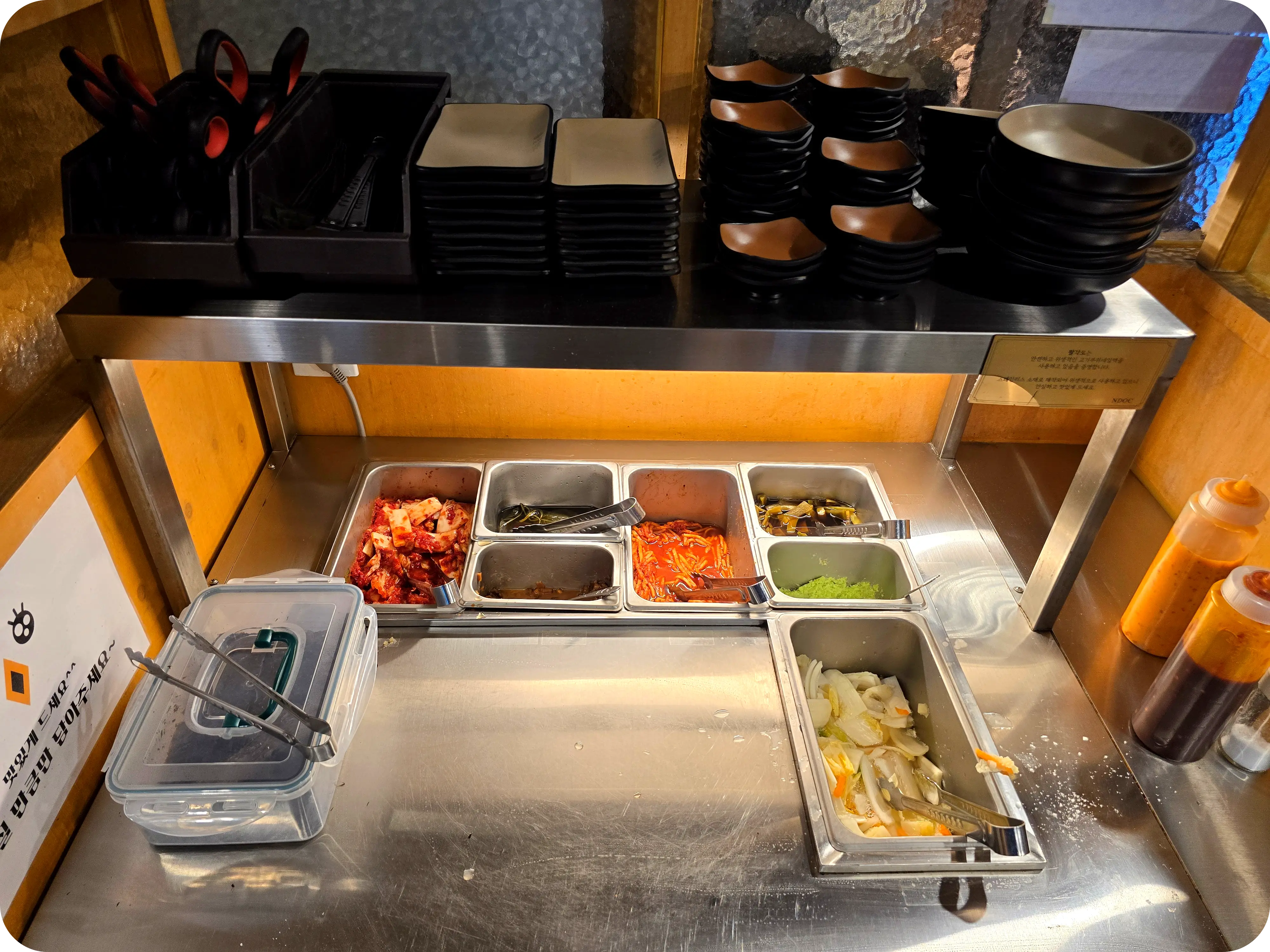 먹다가 모자른 반찬과 소스는 셀프바에 가서 추가로 가져다가 먹으면 된다. 소스는 스리라차마요?, 와사비, 매운 양념, 마늘소스 이렇게 있다. 개인적으로는 그냥 와사비만 올려 소금후추를 찍어먹는 것도 좋았고 마늘양념이 달짝지근해 맛있었다. 매운 소스는 많이 매우니 적당히 찍어먹자.