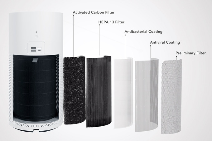 스마트미 공기청정기에 사용된 필터는 5개의 필터로 3단계 시스템을 갖추었다. 큰 먼지나 애완동물의 털, 옷의 보풀 등을 1차적으로 막아주며 그다음은 H13등급의 강력한 필터로 PM2.5의 먼지를 대부분 잡아준다. 마지막으로는 활성탄 필터로 연기나 냄새, TVOC 등을 흡수해주는데 포름알데히드를 정화시켜주는 효과가 있다.