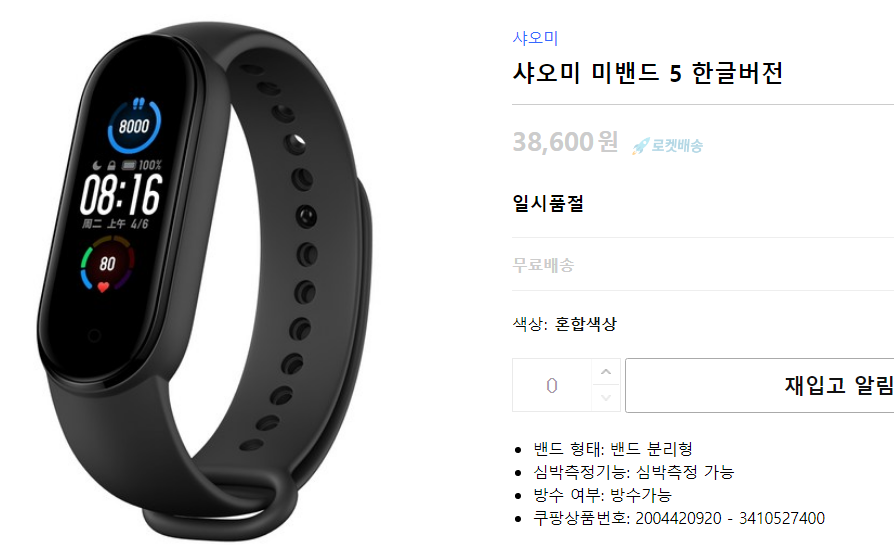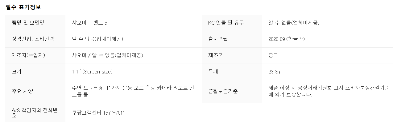 두 번째는 바로 필수 표기정보에 올라가있는 출시년월이다. '2020.09'로 되어있는것을 본다면 쿠팡에서 미밴드5를 판매하는 날짜는 대략 9월초가 되지 않을까 예상을 해본다.