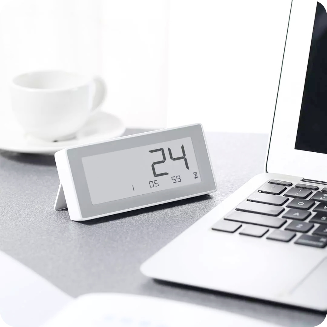 제품의 사진을 보면 전자잉크 온습도계 치고는 두꺼운 모습을 볼 수 있다. 이는 바로 알람 기능이 들어갔기 때문이다. 이번 온습도계는 '미홈' APP과 연동을 하여 알람을 설정하여 지정된 시간에 알람이 울리게 하는 기능이 들어갔으며 타이머 기능도 제공한다.