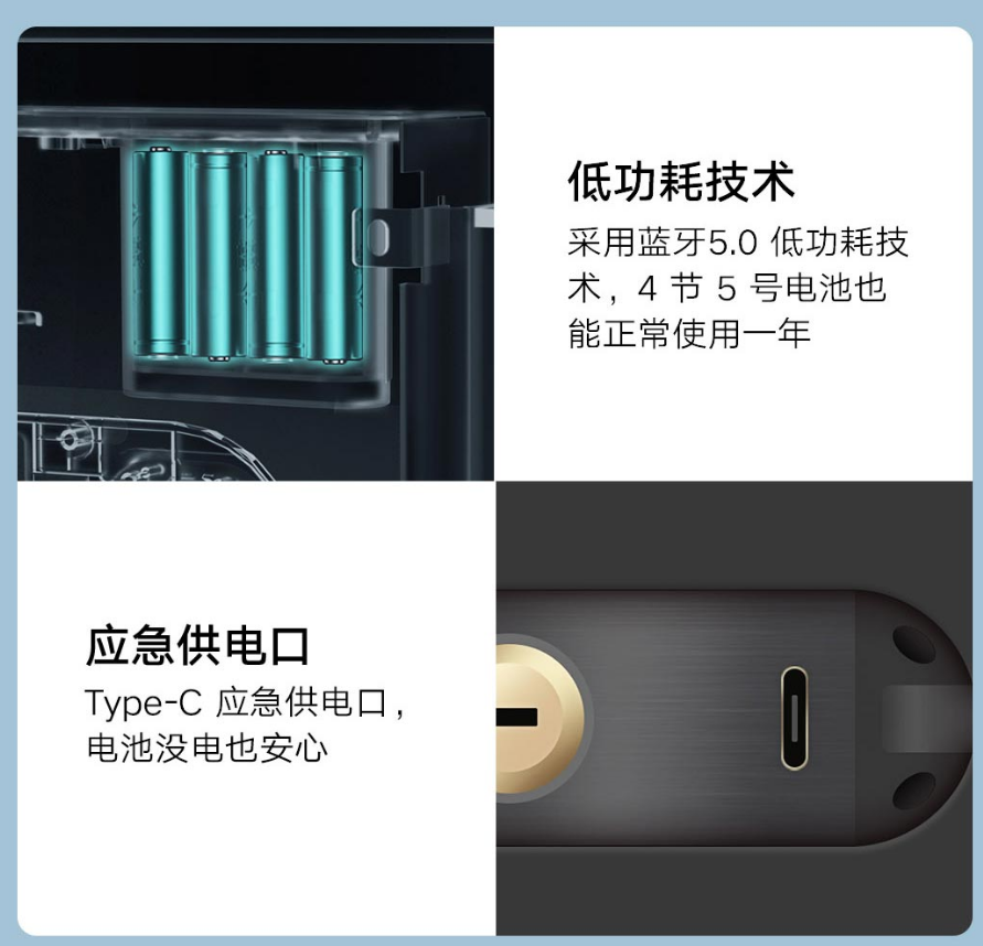 금고는 AA건전지 4개로 작동하게 되며 최대 12개월 동안 사용할 수 있다. 또한 AI스피커를 연동하게 되면 배터리 부족시 AI스피커로 배터리 부족 알림 메시지가 나오며 배터리가 없어 전원이 나갈 시에는 비상전력을 USB-C 타입으로 넣어 열 수 있으니 걱정할 필요는 없다.