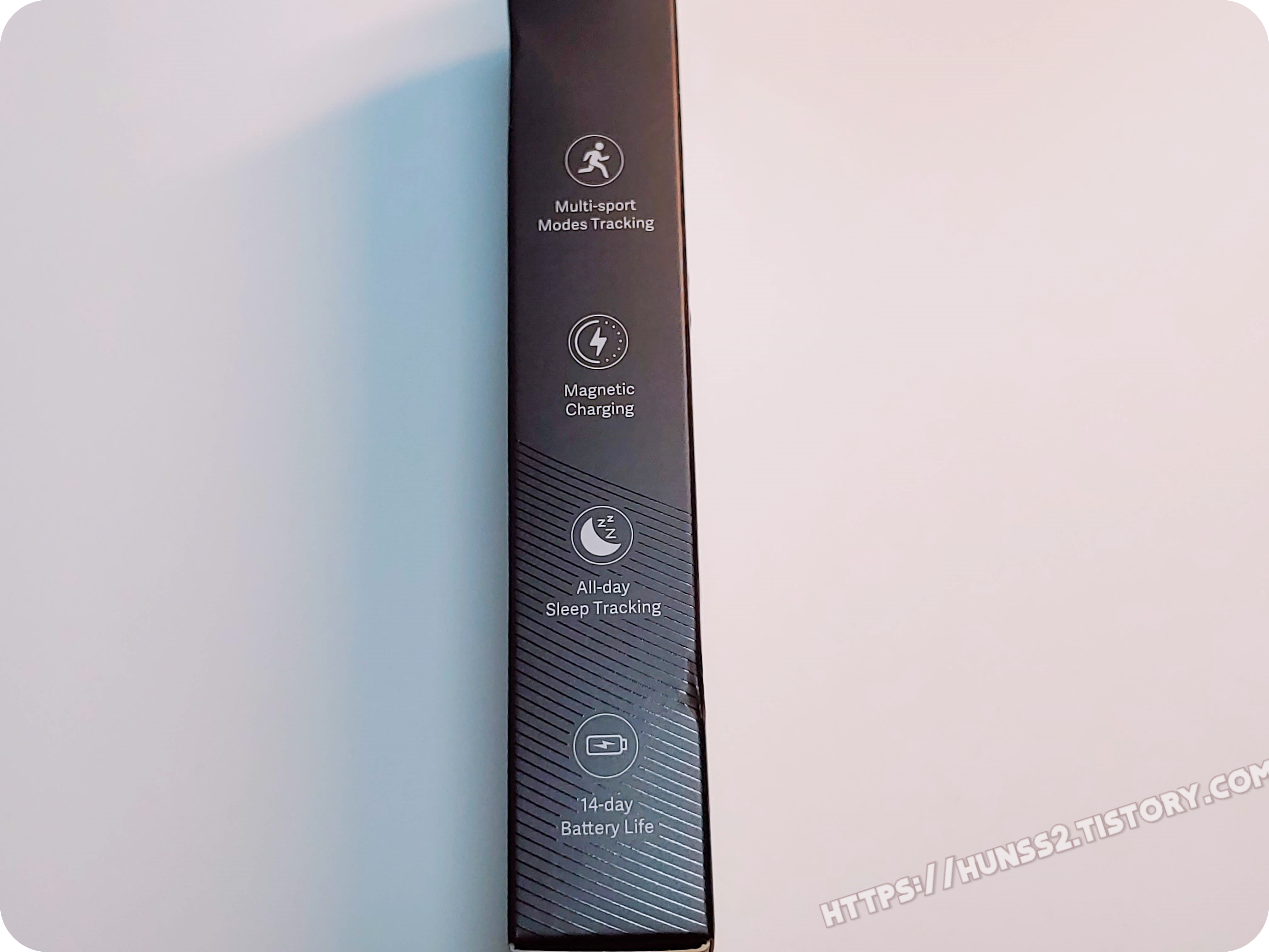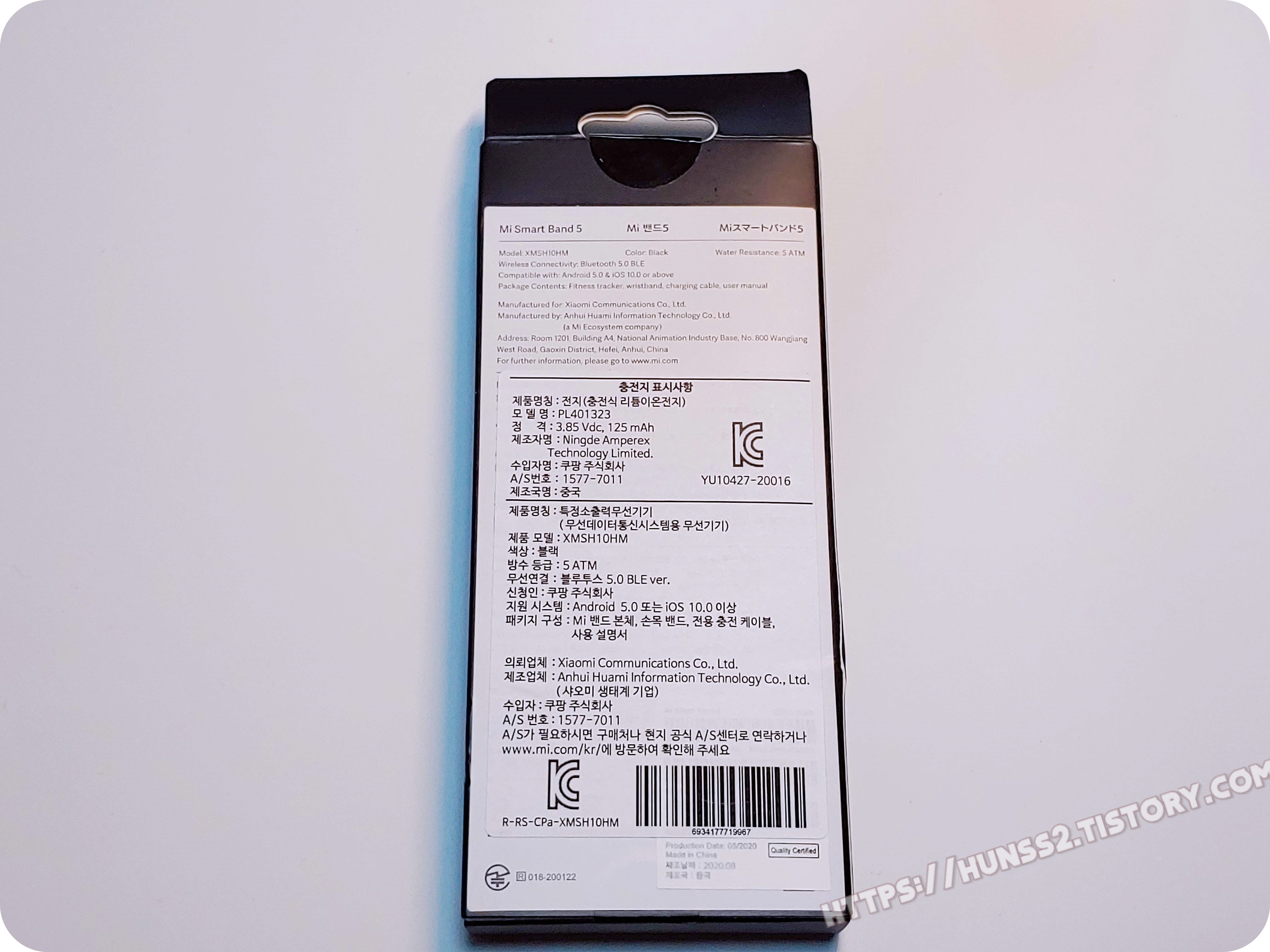 측면에는 미밴드5의 특징들이 나와있고요. 후면부에는 한글로 되어있는 별도의 스티커가 부착되어있는 것이 보입니다. 쿠팡에서 수입하여 판매를 하지만 별도의 KC인증 작업은 한국에 들어와 진행을 하였나 봐요.
