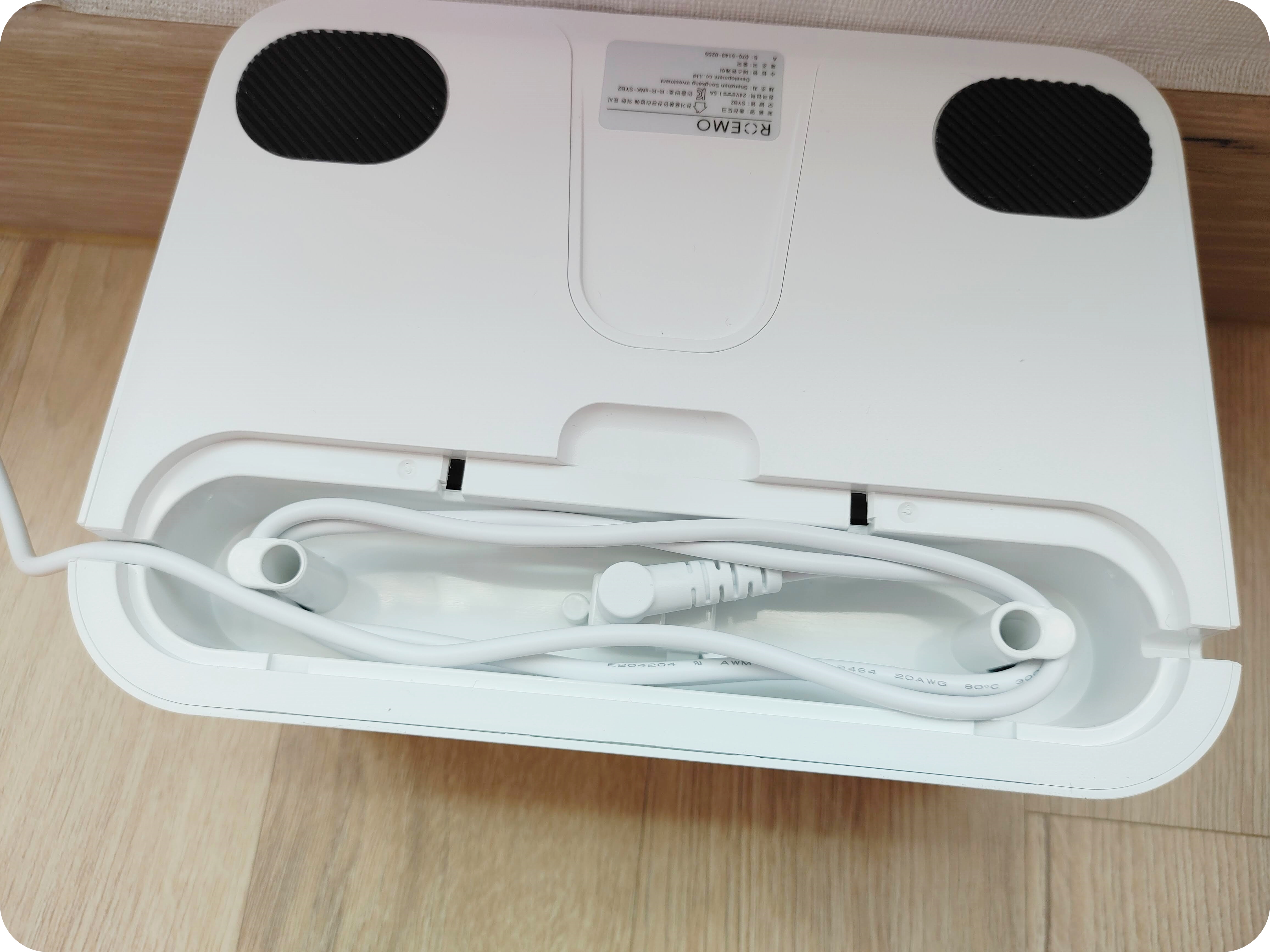 충전독은 작은 사이즈는 아닌데요. 그 덕분에 안쪽에 공간이 있어 충전선을 정리하여 깔끔하게 사용할 수 있어요. 게다가 충전독이 크기에 양면테이프가 필요 없이 바닥에 고정이 잘 되더라고요. 4개의 고무 패드가 잘 밀착해주네요.