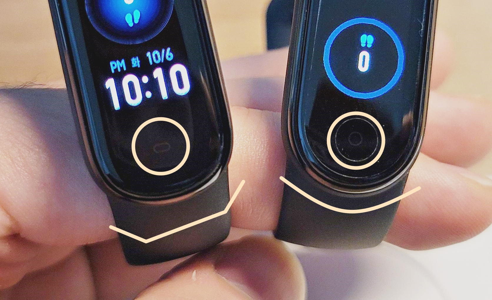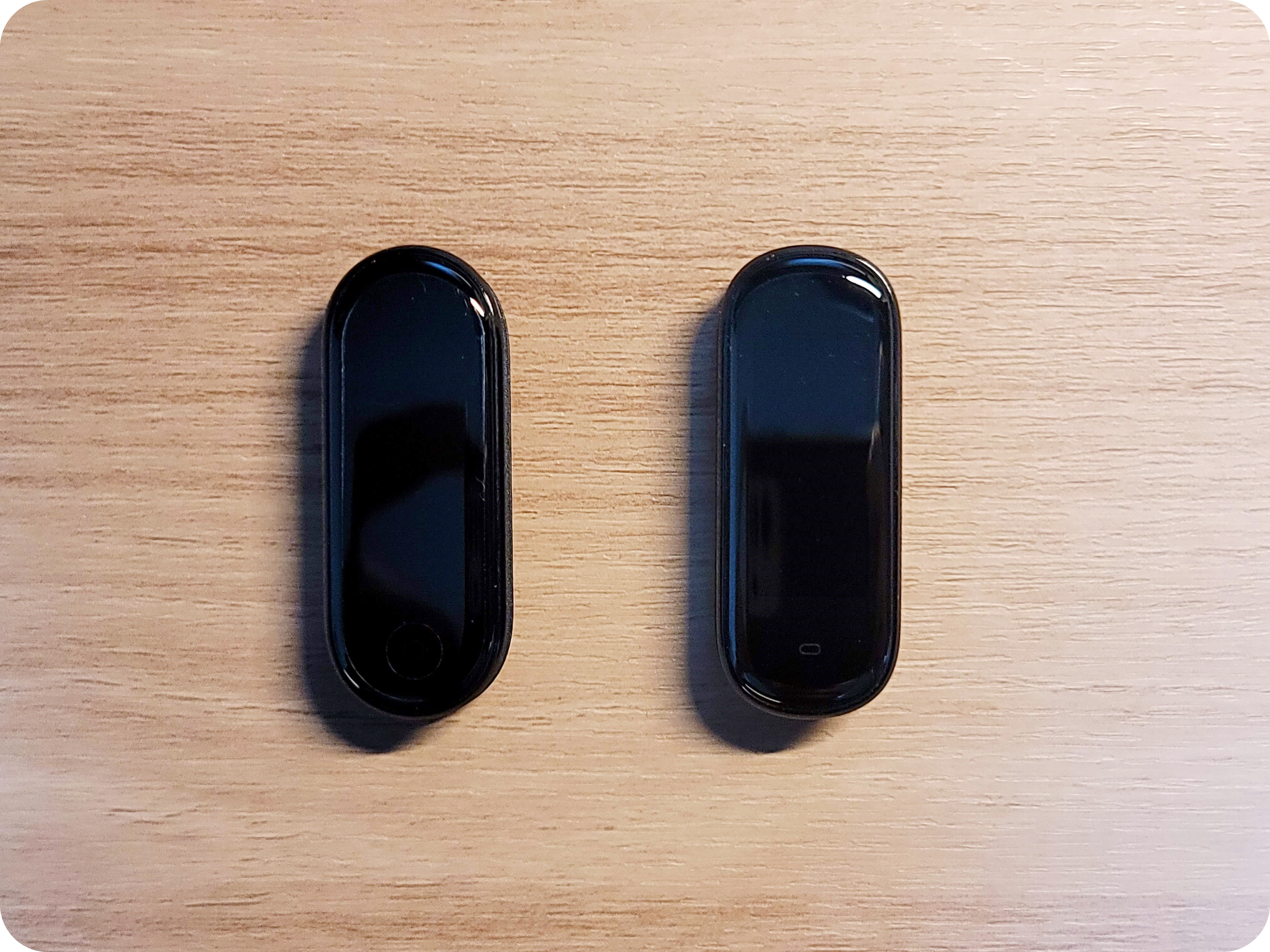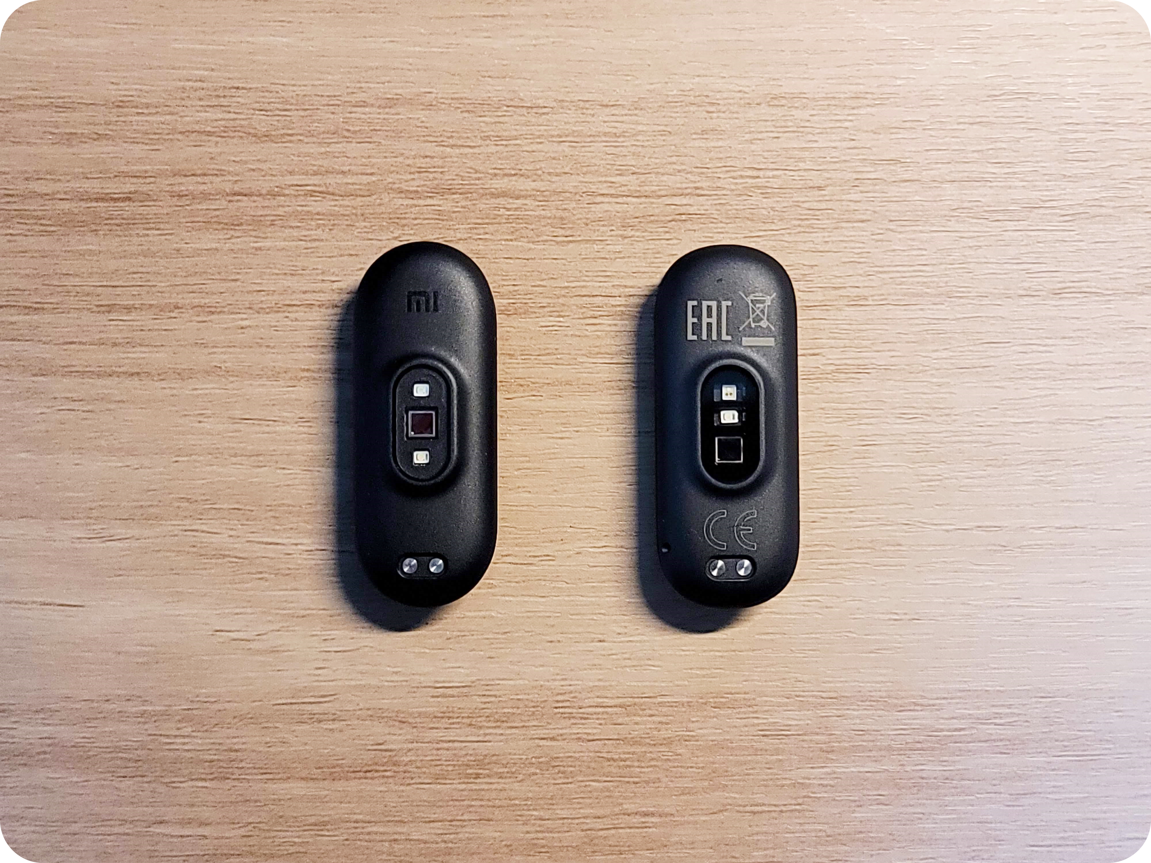 두 제품 간의 외형 차이가 느껴지시나요? 두 제품간의 차이는 거의 없지만 어메이즈핏 밴드5의 외형이 조금 더 둥근 사각(타원형)모양을 띄고있어요. 미밴드가 좀 더 원형으로 라운드 처리가 되어있어서 아주 미세한 차이가 있는걸 알 수 있어요.