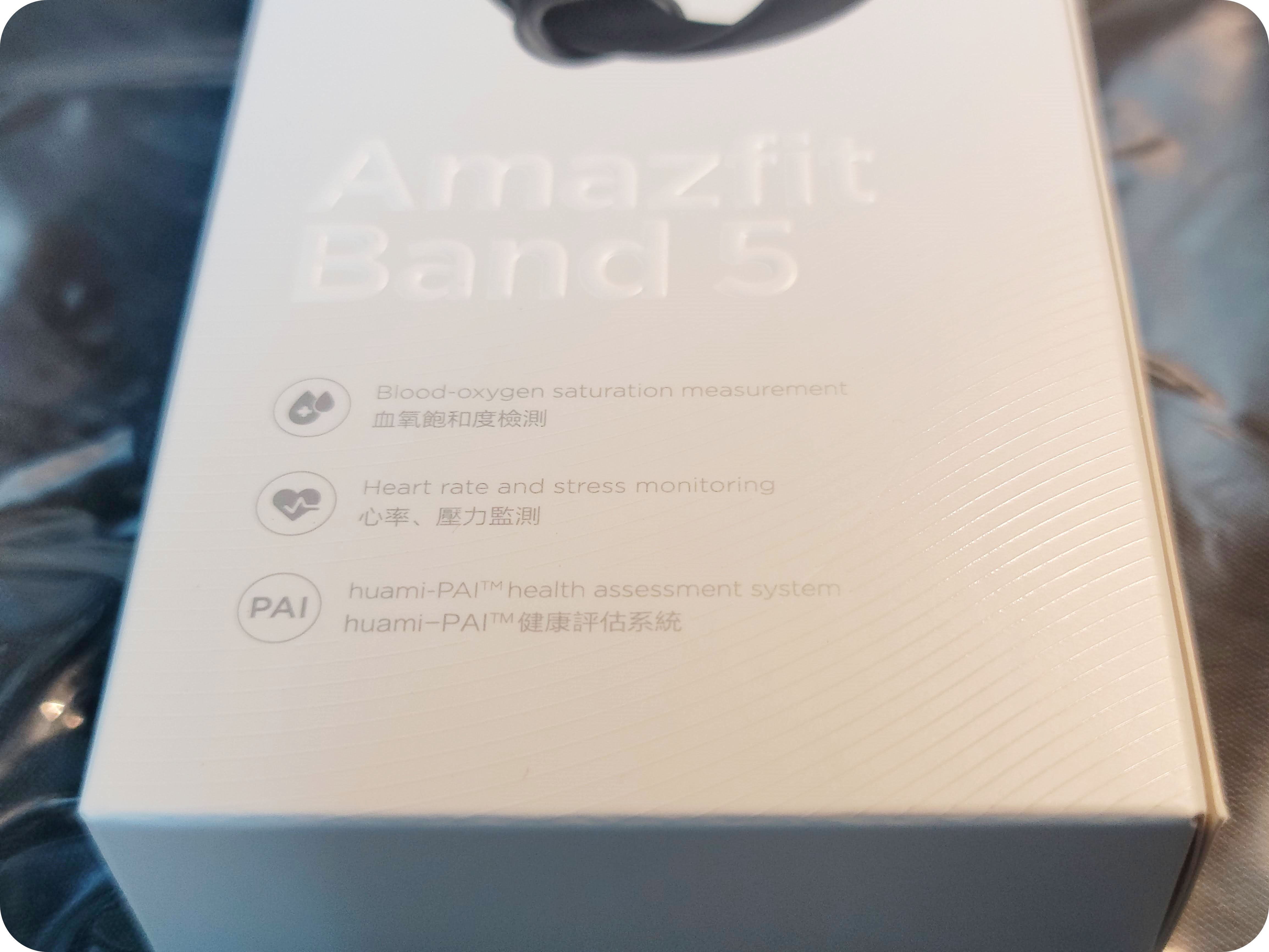 어메이즈핏 밴드5의 상자는 미밴드5와는 다르게 깔끔한 흰색으로 되어있어요. 특히 미밴드5와의 가장 큰 차이점은 바로 산소포화도 측정인데요. 이 부분이 상자에 적혀있답니다.