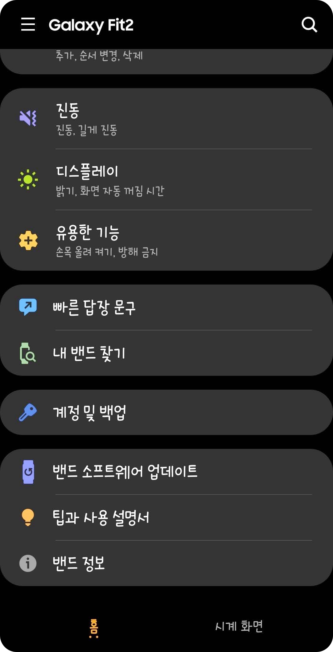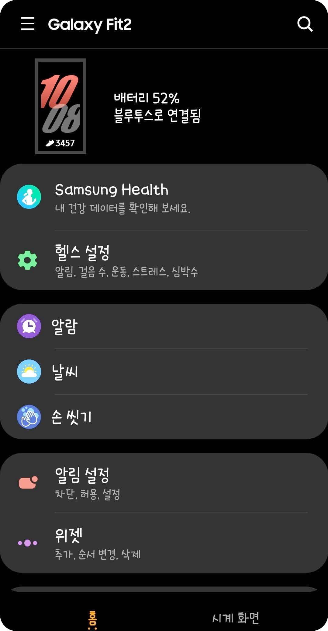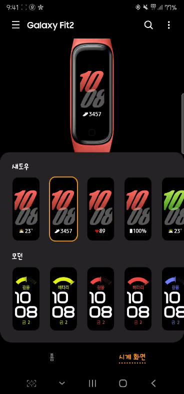 갤럭시 웨어러블 어플로 연동을 하면 다양한 밴드 설정이 가능합니다. 직관적인 UI로 설정을 하기 아주 쉽게 되어있어요. 또한 하단의 시계 화면을 클릭하면 갤럭시 핏2의 워치 페이스를 변경할 수 있어요.