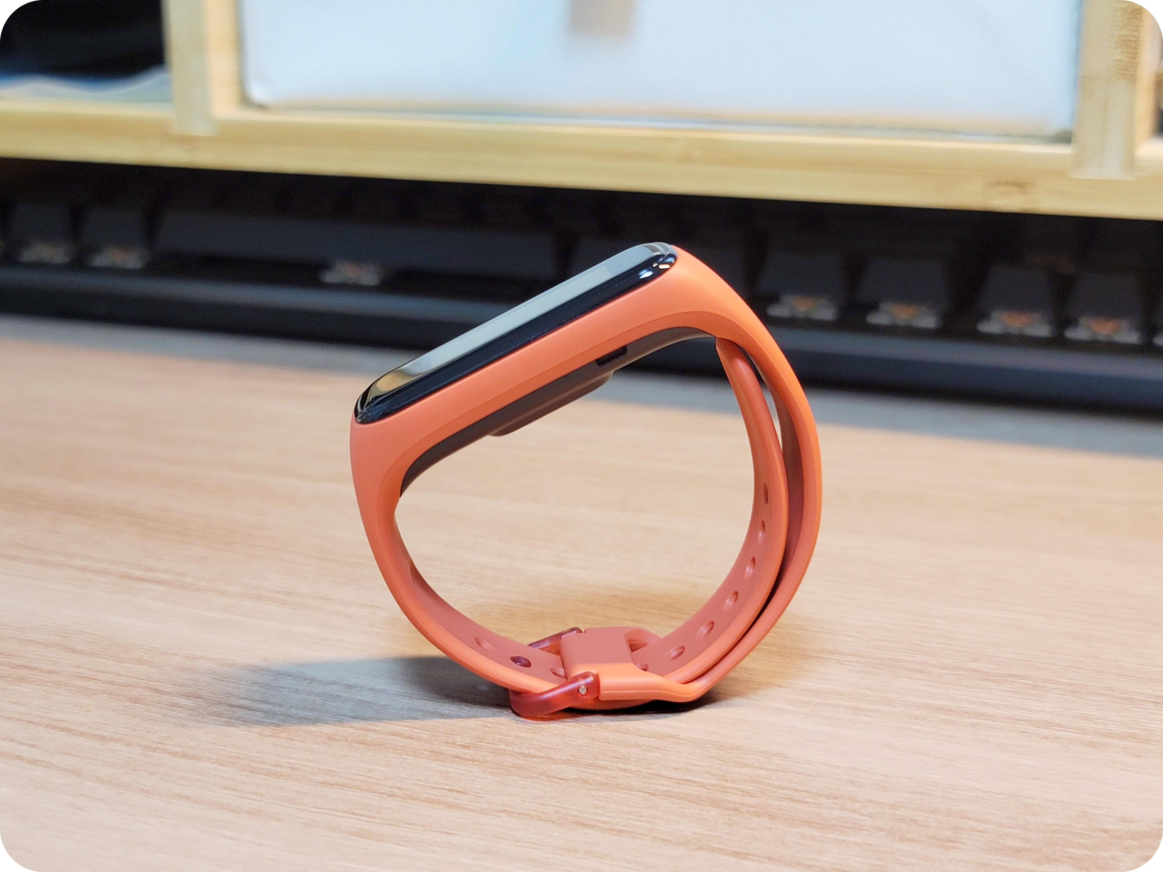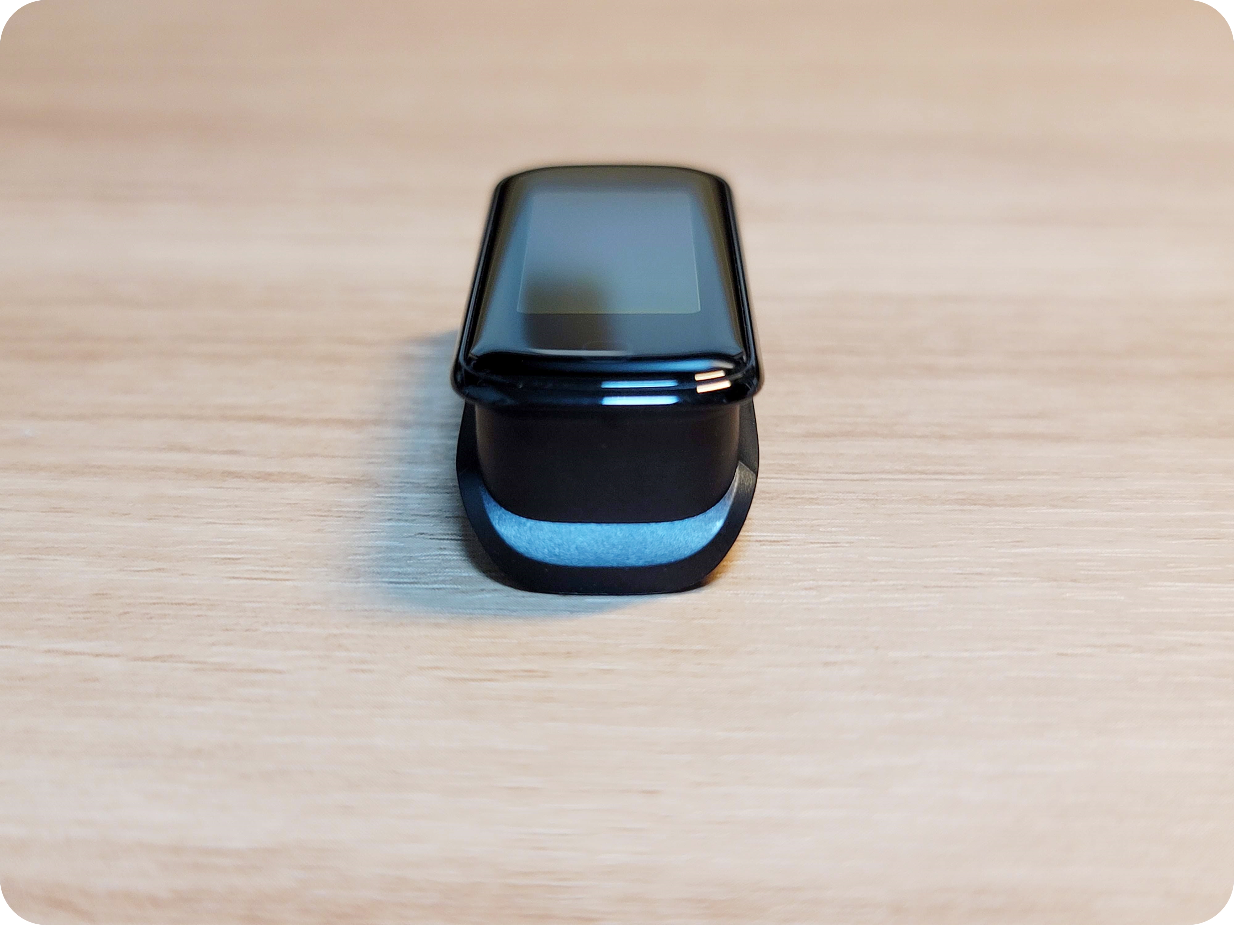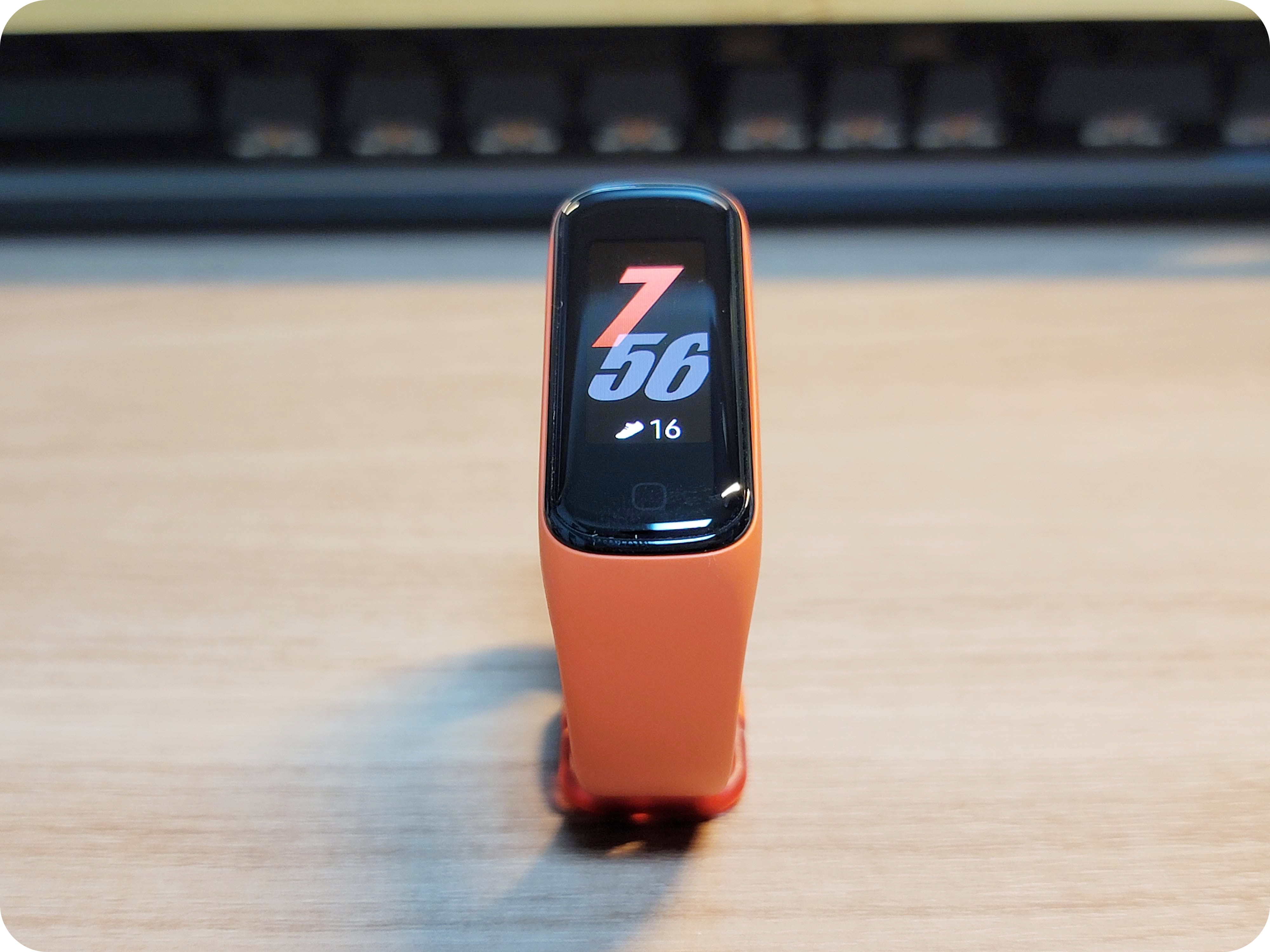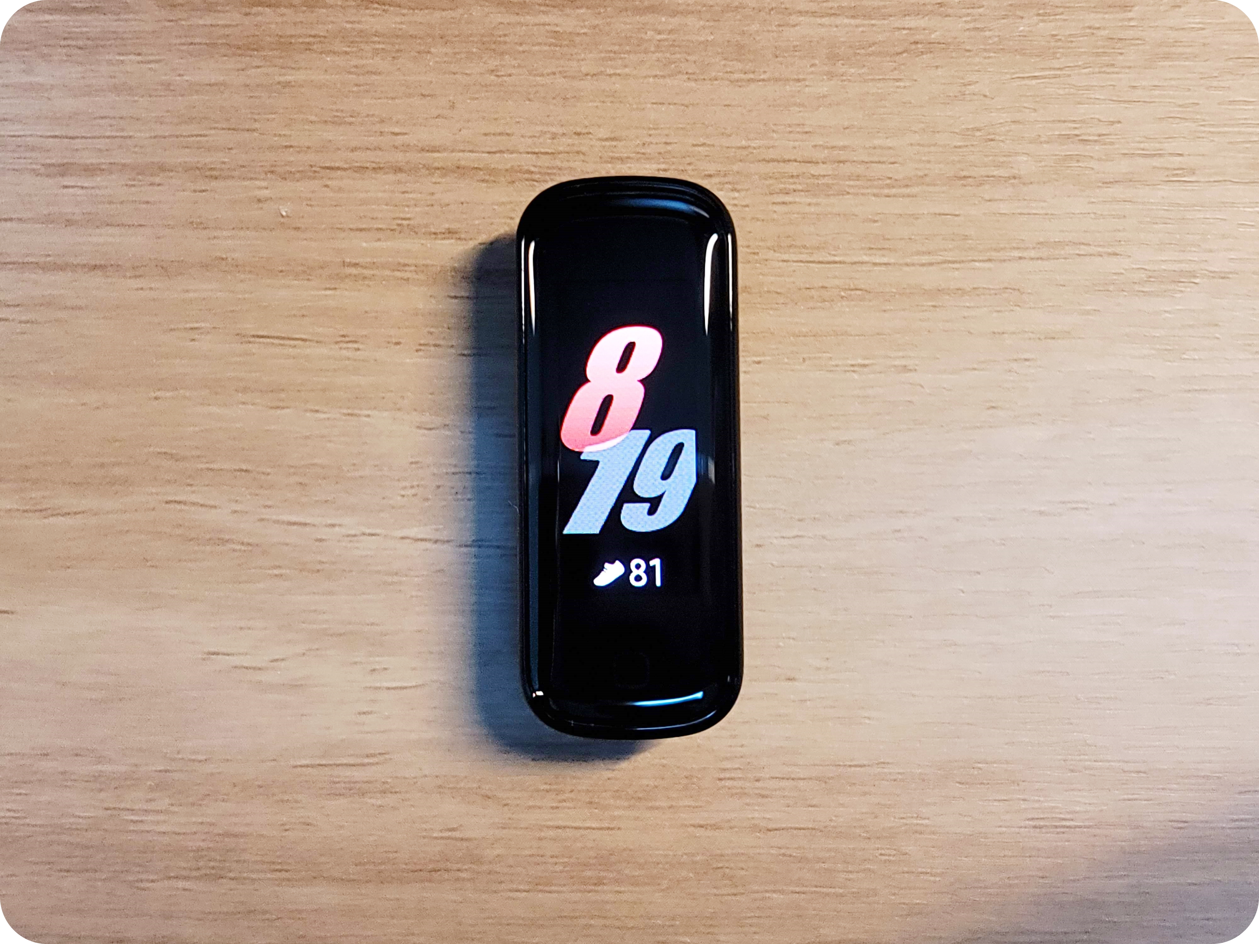 핏2는 핏 1세대처럼 사각형의 디스플레이로 되어있어요. 그렇기에 미밴드 시리즈와는 또 다른 매력이 있는 것 같아요. 제품의 윗면은 1.1인치의 AMOLED 디스플레이로 되어있고 그 아래에는 터치버튼이 존재합니다. 미밴드와 똑같아요.