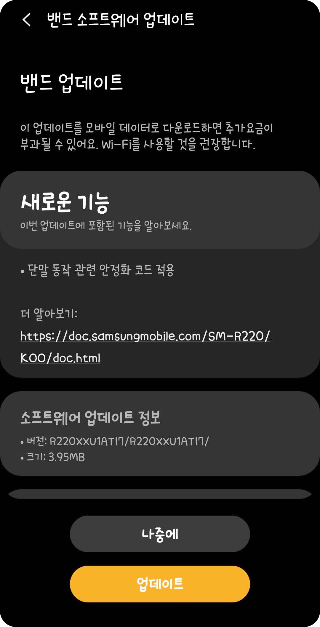 연결을 시작하면 밴드에 알림이 뜨고 확인을 눌러주면 알아서 연동이 시작되는데요. 처음 연동하면 바로 업데이트를 하라고 알려줍니다. 업데이트는 꽤 오래 걸리니 여유를 가지고 업데이트를 진행해주세요.