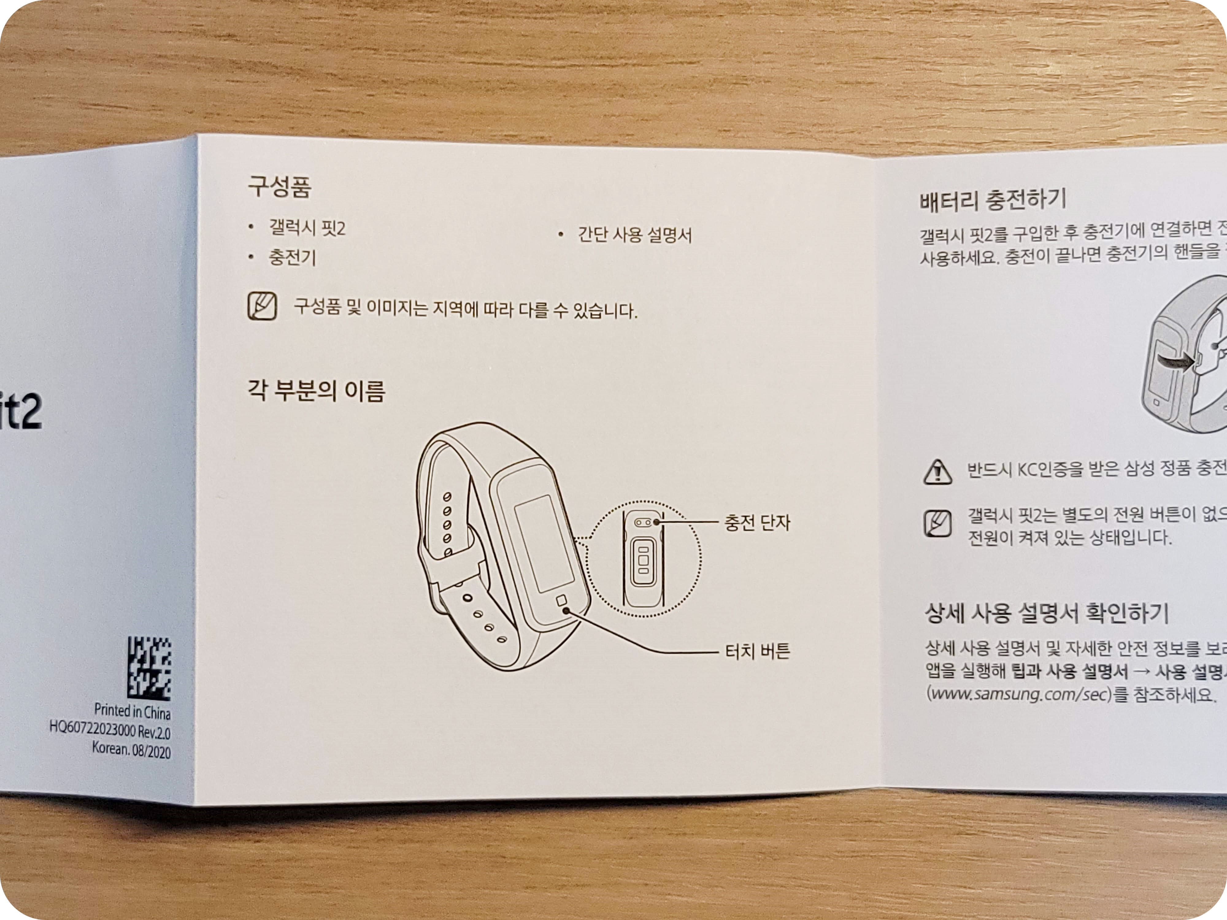 갤럭시 핏2의 상자는 꽤나 깔끔하게 되어있습니다. 샤오미 미밴드 제품을 많이 구매했던 저는 단출한 포장에 익숙해져 있었는지 갤럭시 핏2의 상자는 견고하게 되어있어 받는 느낌이 좋았어요.