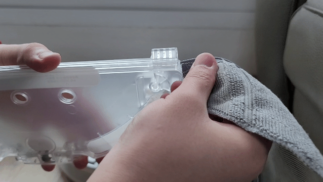 걸레는 다른 로봇청소기와 비슷하게 홈에 껴서 걸레판에 장착을 해주면 됩니다. 걸레판 또한 로봇청소기 뒷면에 슥 밀어 넣으면 끝이에요.