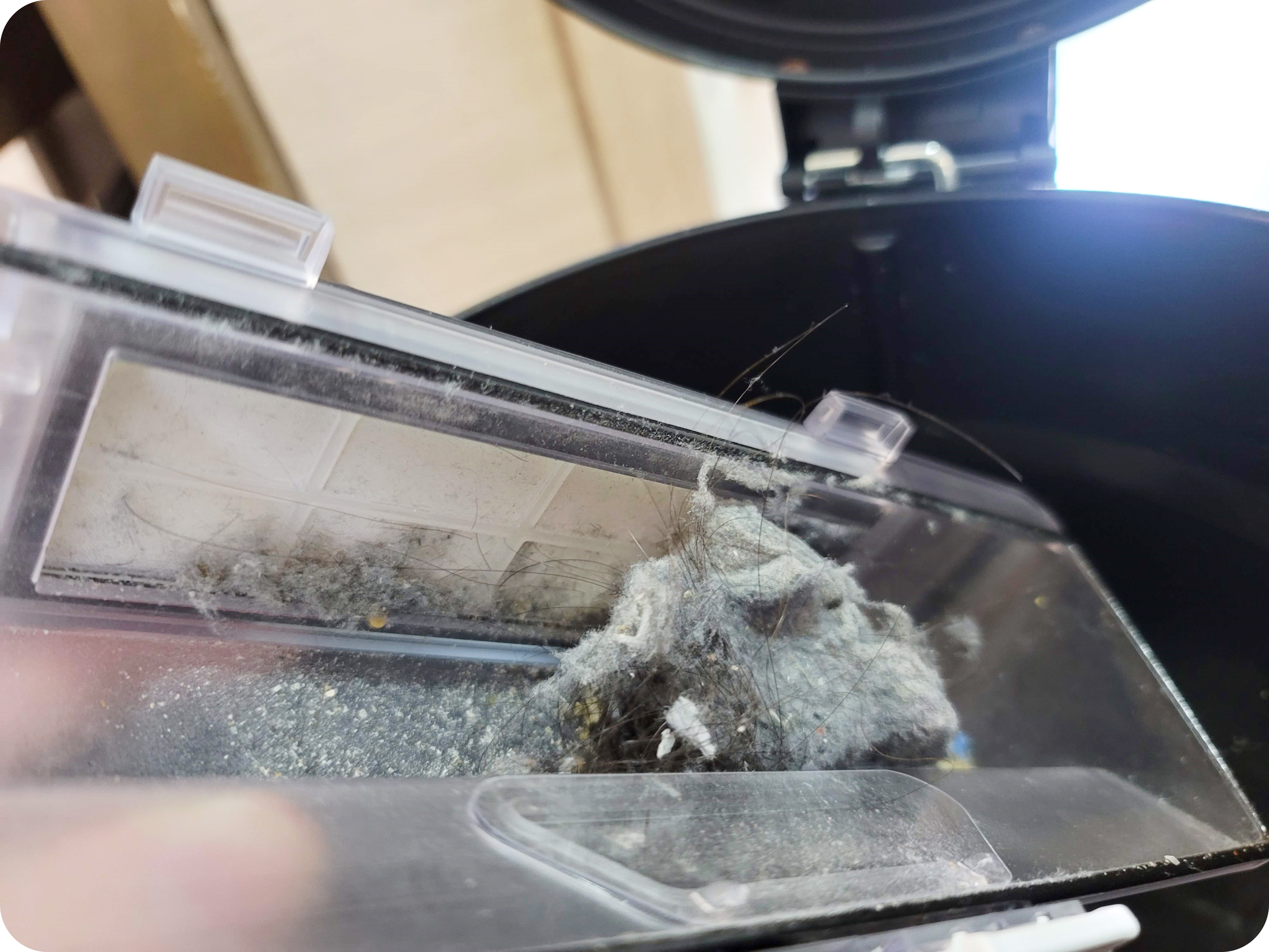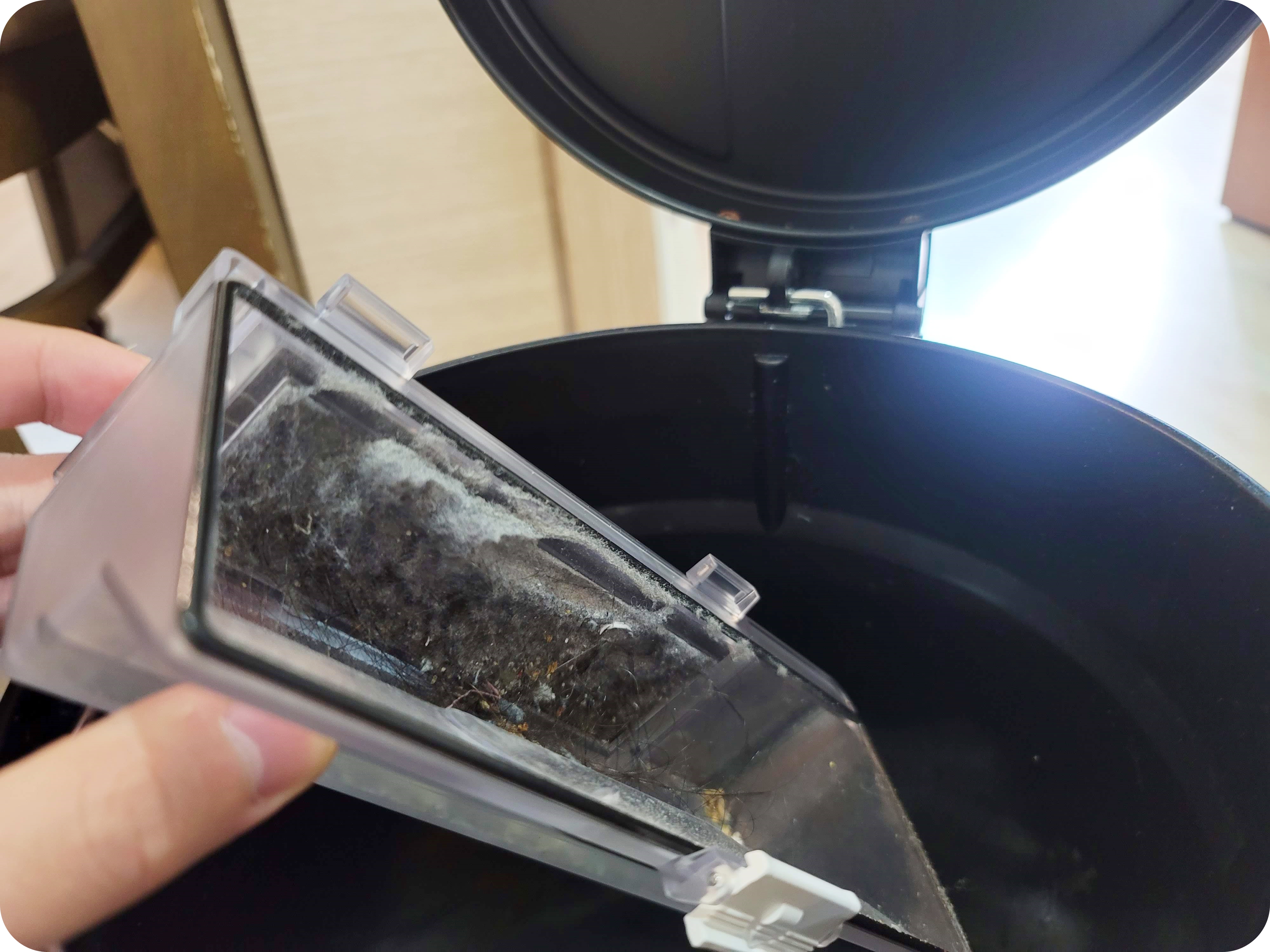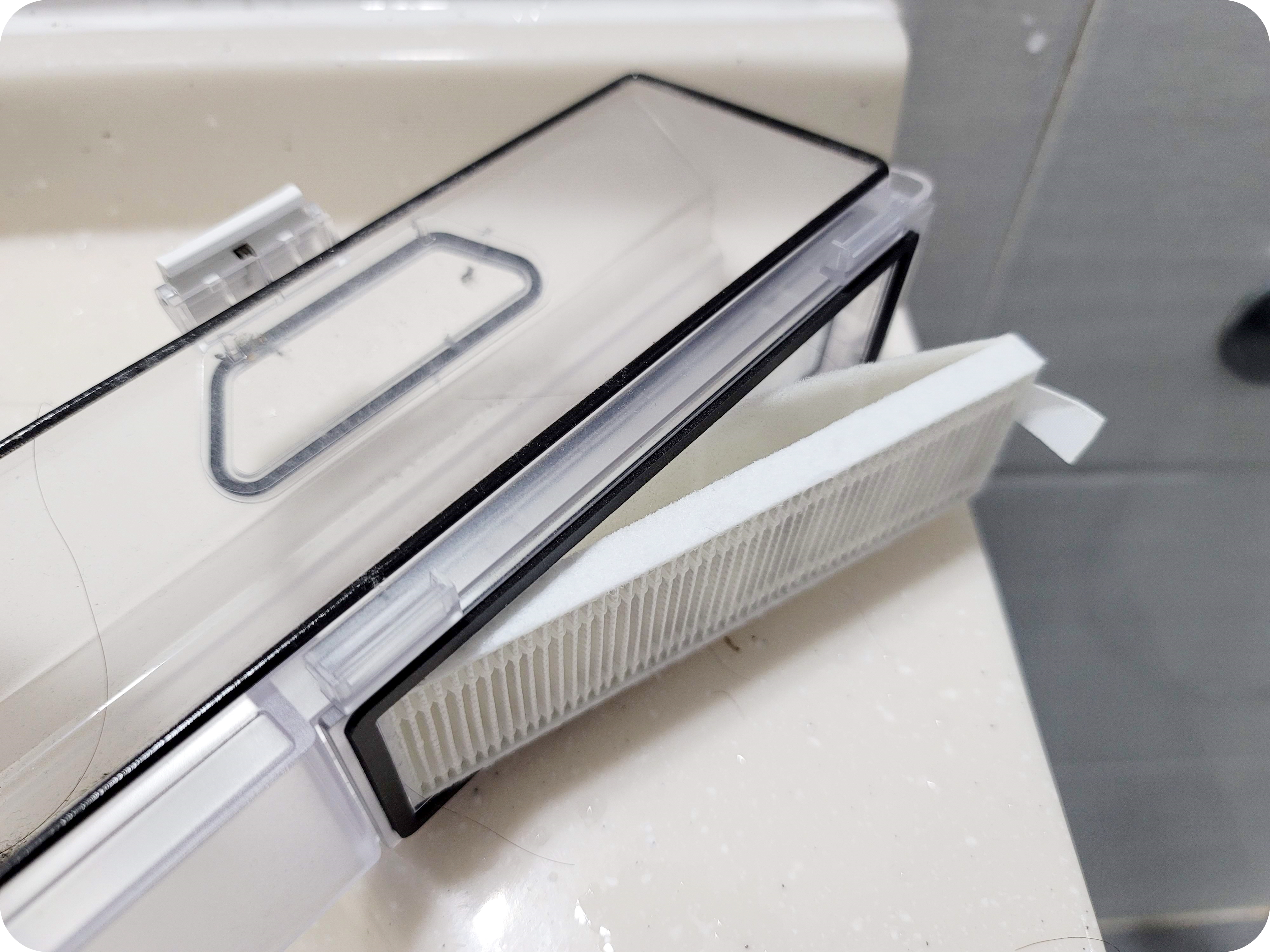 1차적으로 매쉬 필터가 있기 때문에 먼지통에서 먼지를 비워줄때 아주 쉽게 먼지가 빠졌어요. 이 매쉬필터가 없는 로봇청소기는 HEPA필터 사이사이 먼지가 들어가기 때문에 먼지통을 비워줄 때마다 먼지가 날리는 경험을 하게 된답니다.