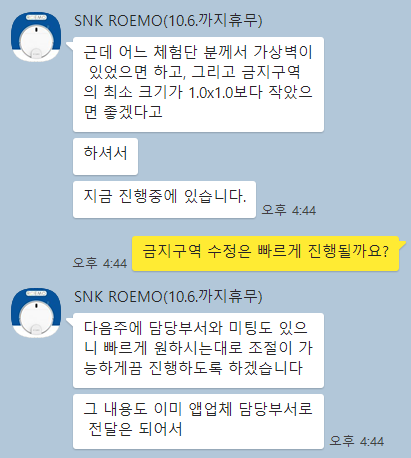 처음 로이모 로봇청소기를 사용할 때는 금지구역 설정에 많은 아쉬움이 있었습니다. 기존에는 금지구역 설정이 1.0m x 1.0m가 최소 사이즈로 작은 물체를 설정하기는 아쉬웠어요. 로이모 고객센터에 문의를 했었고 저뿐만 아니라 다른 분들도 문의를 했었던 것 같더라고요.