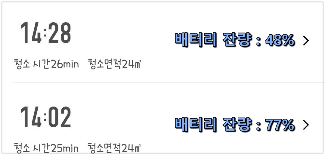 로이모 로봇청소기는 LG 5200mAh의 대용량 배터리가 탑재되어 최대 3시간동안 청소를 할 수 있다고 합니다. 저희 집이 크지 않아 3시간 동안 작동을 해보지는 못하였는데요. 흡입력 MAX(최대), 물걸레 출수량 최대로 설정하여 청소를 돌려본 결과 약 1시간동안 50㎡의 면적을 청소하면서 50% 정도의 배터리를 소모했습니다.