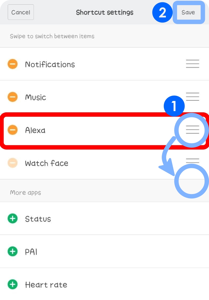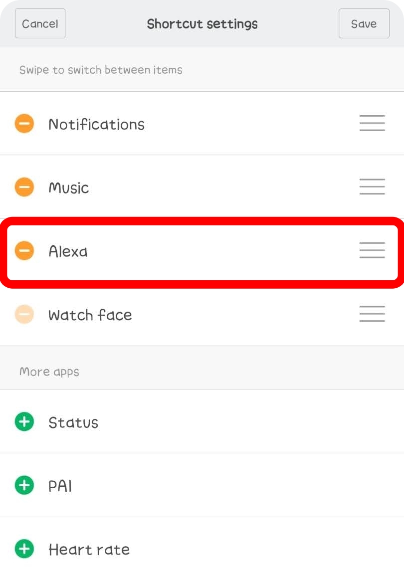 알렉사를 이용할 수 있는 방법은 시계 화면에서 좌/우측으로 스와이프 하여 사용하는 방법밖에는 없습니다. 그래서 별도의 메뉴도 보이지 않아 설정 같은 것은 할 수 없어요.