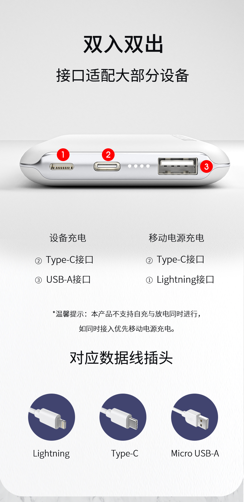 여기에 포트는 총 3개로 구성되어있는데요. 입력 포트는 라이트닝, USB-C로 되어있으며 출력 포트는 USB-A, USB-C 각 1개씩 구성되어있습니다. 요즘 잘 쓰지 않는 마이크로 5핀 포트를 뺀 부분은 좋은 생각인 것 같아요.