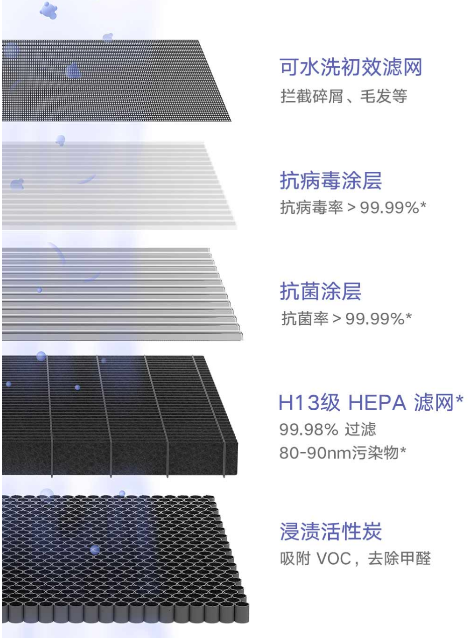 미에어X에는 큰 먼지와 머리카락을 걸러주는 세척 가능한 1단계 필터, 99.99%의 항바이러스 코팅이 된 2단계 필터, 99.99%의 항균 코팅이 된 3단계 필터, H13등급의 4단계 헤파필터, VOC와 포름알데히드를 제거해주는 5단계 활성탄 필터가 들어가 있습니다. 5가지 필터로 다방면으로 공기정화가 가능합니다.
