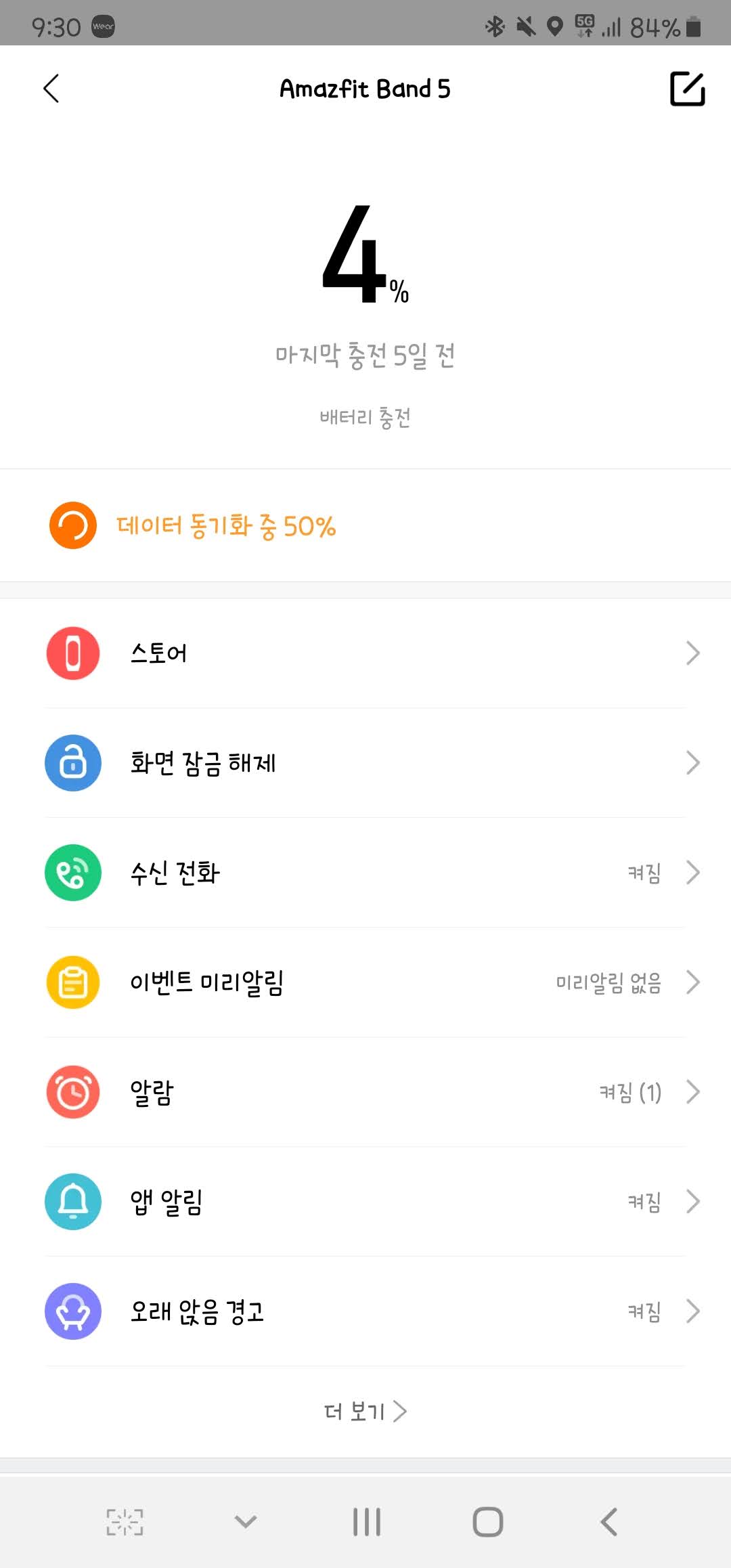 미밴드5보다 좀 더 오래간다던 어메이즈핏 밴드5의 실제 배터리 타임은 5~6일 정도밖에 되지 않았습니다. 여기에 수면 시 산소포화도를 측정하는 기능을 꺼도 별반 차이가 없었다는 점이 상당히 아쉬웠어요.