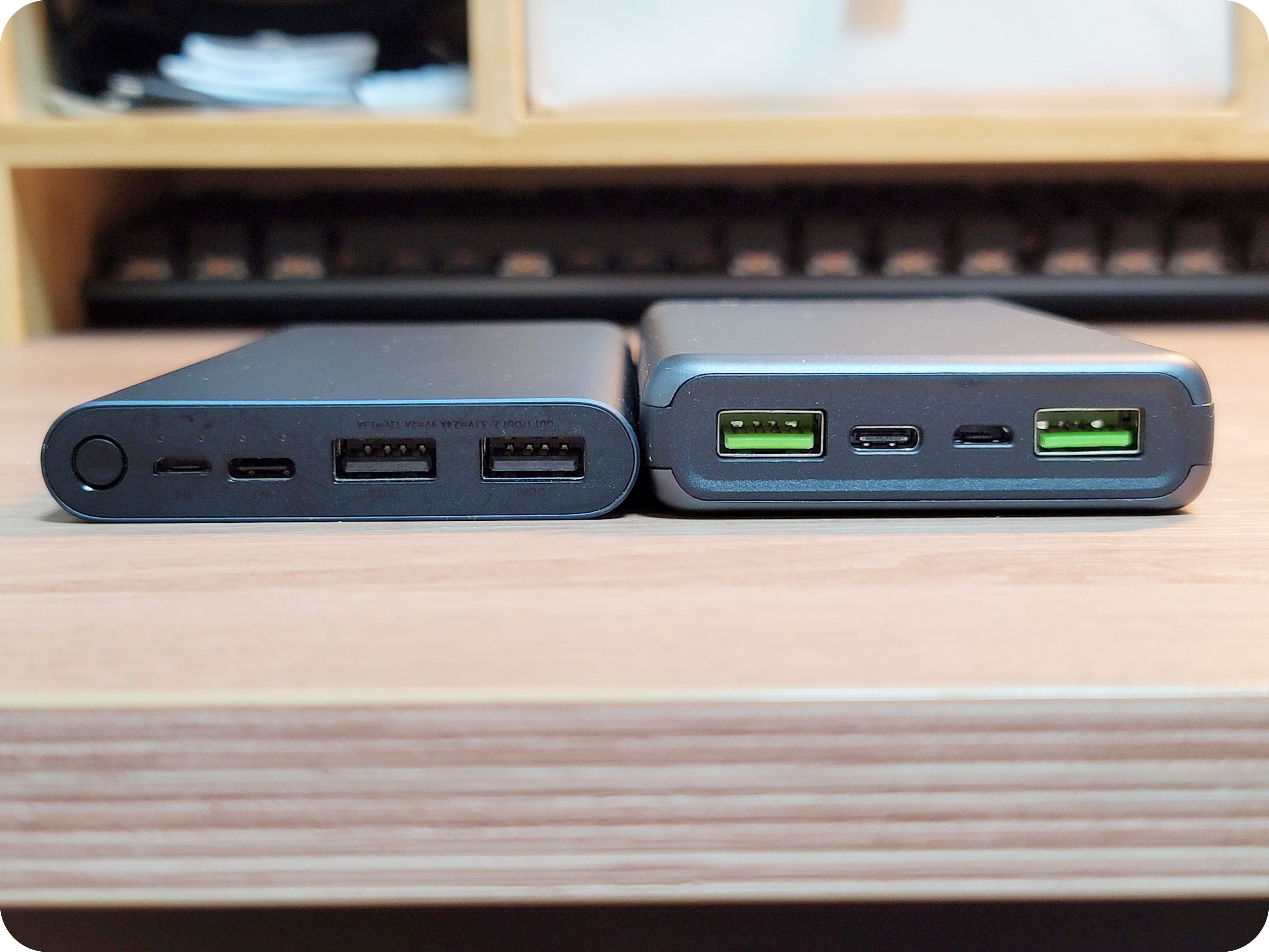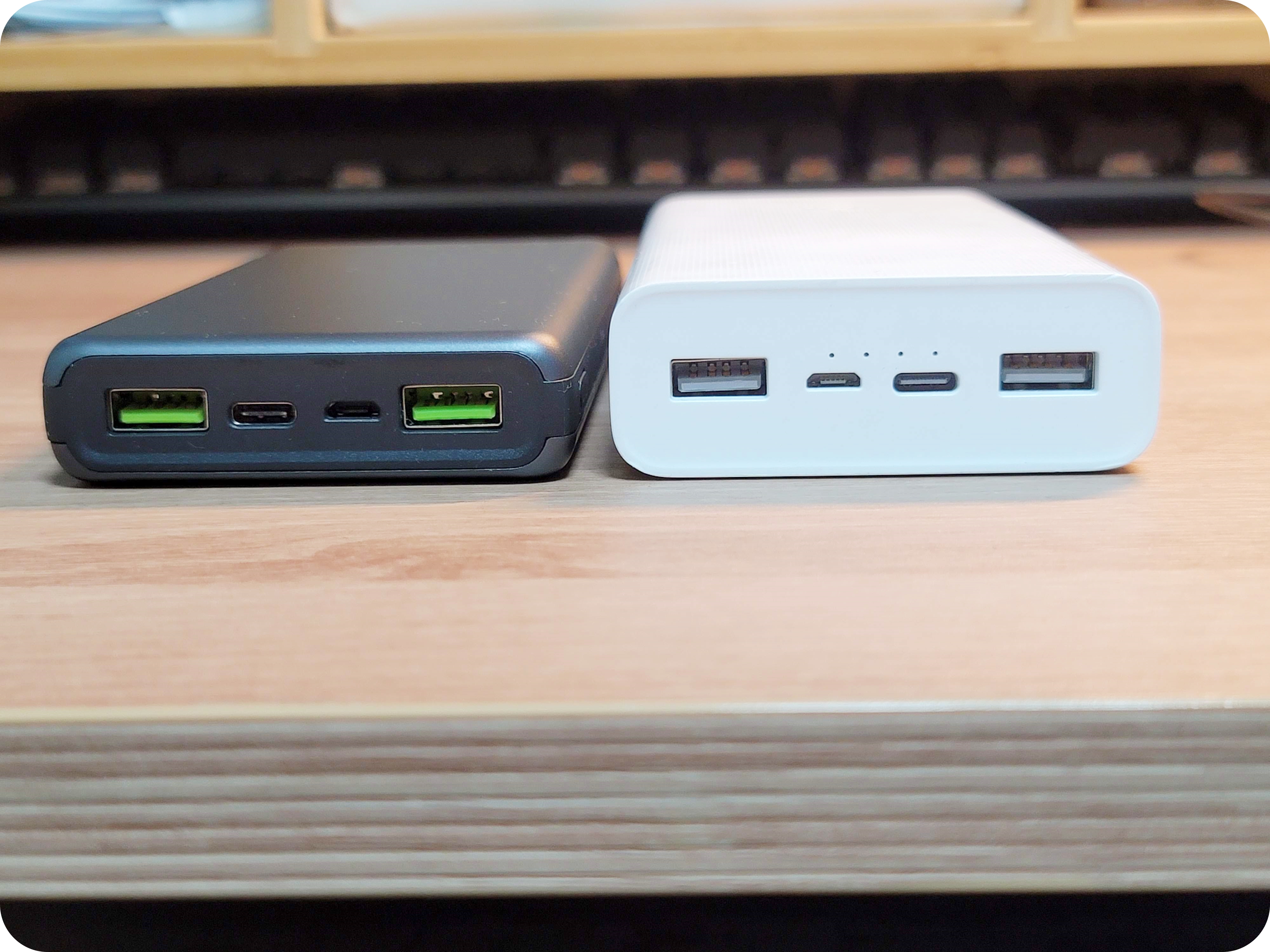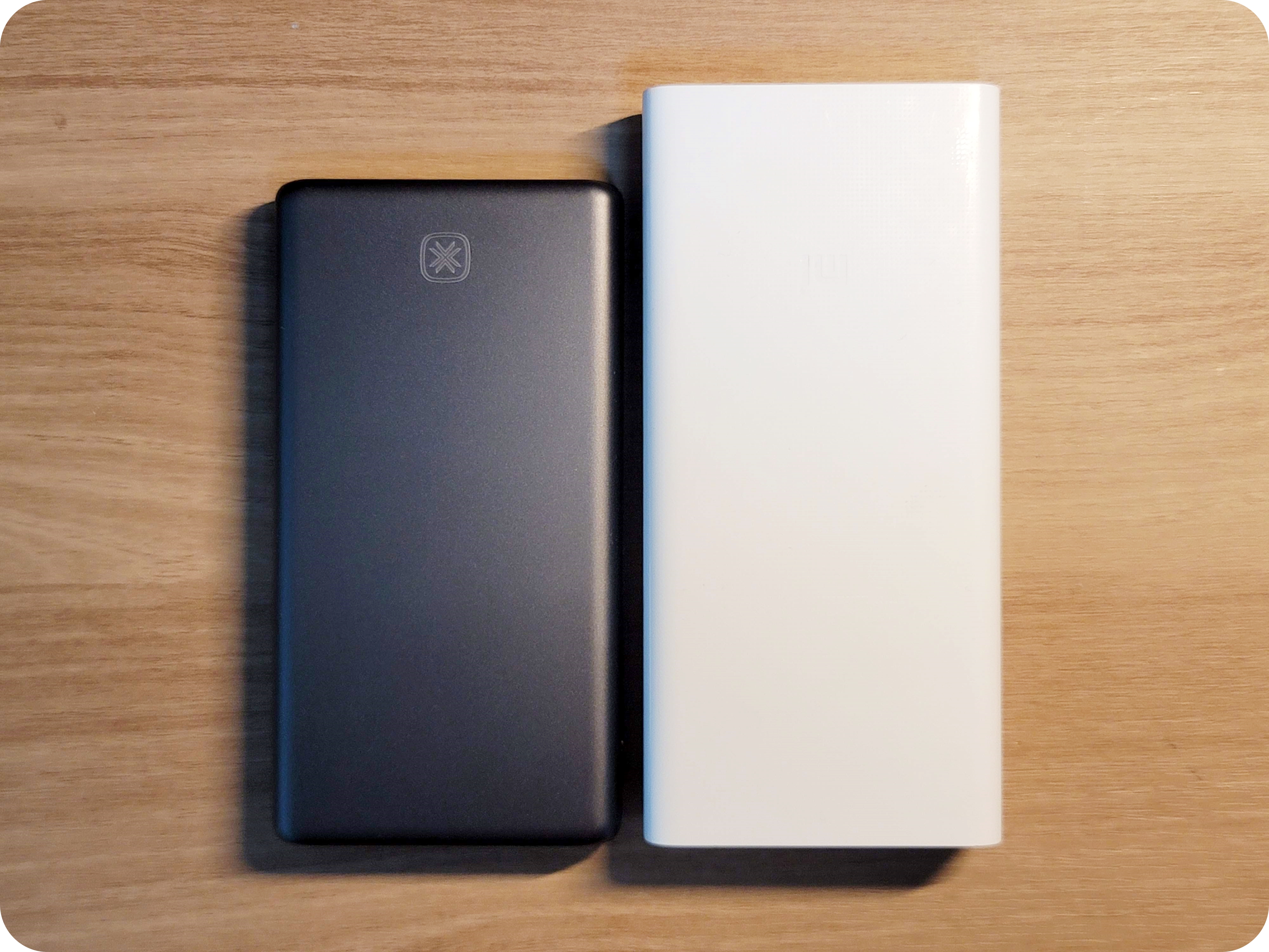 이번에는 샤오미 2만 용량의 보조배터리와 비교를 해보았어요. 이번 역시 같은 포트 구성으로 배터리 용량만 뺀다면 스펙은 동일합니다. 제품의 크기와 두께 차이가 보이시죠?