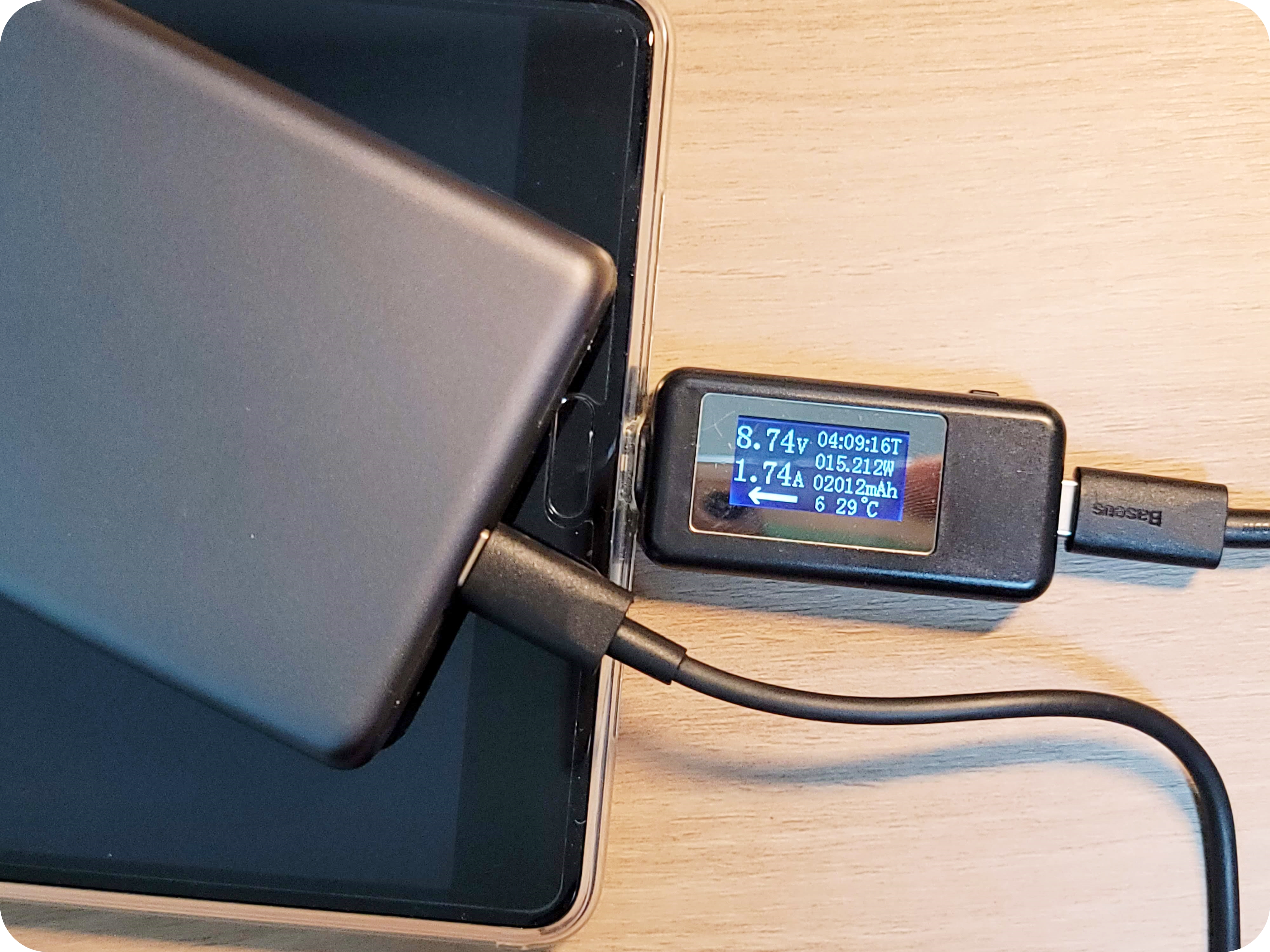 이번에는 다른 제품을 충전해보았습니다. LG기기에서는 12V의 고속 충전이 되는 것을 확인할 수 있었으며 화웨이 M5 태블릿에는 9V 2A정도의 18W 고속 충전이 되는 것을 확인되었어요.