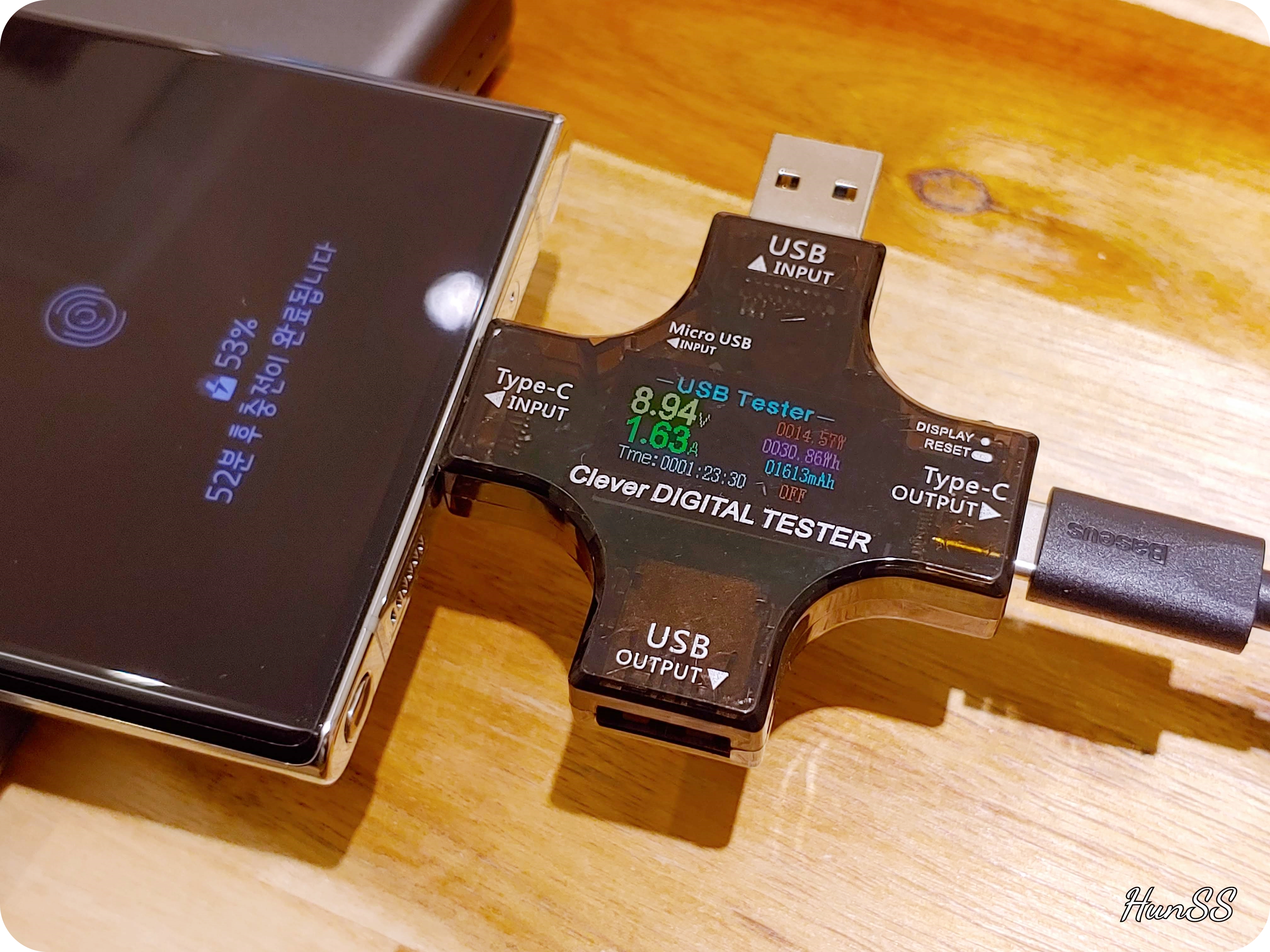 먼저 C타입을 이용하여 갤럭시 노트20울트라를 충전해보았어요. 9V 1.5A 15W 정도로 충전이 되는 것을 확인할 수 있었습니다. 갤럭시 제품은 AFC충전방식을 지원하여 15W로 고속 충전을 지원하는데 정확히 15W로 충전이 되는 것을 볼 수 있어요.